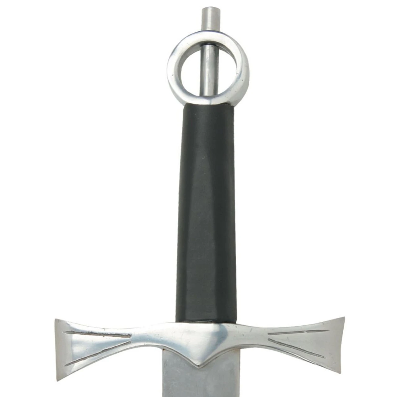 This sword comes with a factory edge and is constructed of stainless steel. The V cross guard flares on both sides with two grooves etched on both sides. The handle is wrapped in faux leather and the pommel features an open Irish Ring design. Included is a leather sheath with belt loop. Overall Length: 41.50 Inches.