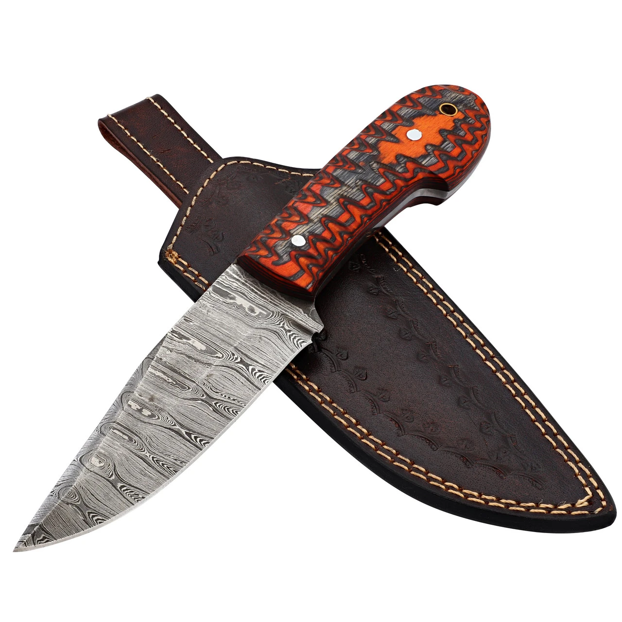 The red zigzags up the handle; erratically climbing beside the black like a hunter chasing a sign of movement. The Jagged Rose Hunting Knife is a full tang knife with a gorgeous, hand forged Damascus steel blade. Force welded to the tang, this piece is durable and functional. The birch wood scales are secured to the tang in three places; two by mosaic pins and one by the hollow brass lanyard hole. These scales are dyed a dynamic zigzag tie-dye pattern of red and black for a stunning visual that complements the patterned blade perfectly. The Jagged Rose Damascus Hunting Knife is 9.25 inches long overall with a 4.5-inch blade so it would be best suited for small to medium game. Included is a dark brown genuine leather sheath for easy carry and safe storage. Overall Length: 9.25 Inches. Weight: 0.55 lbs.