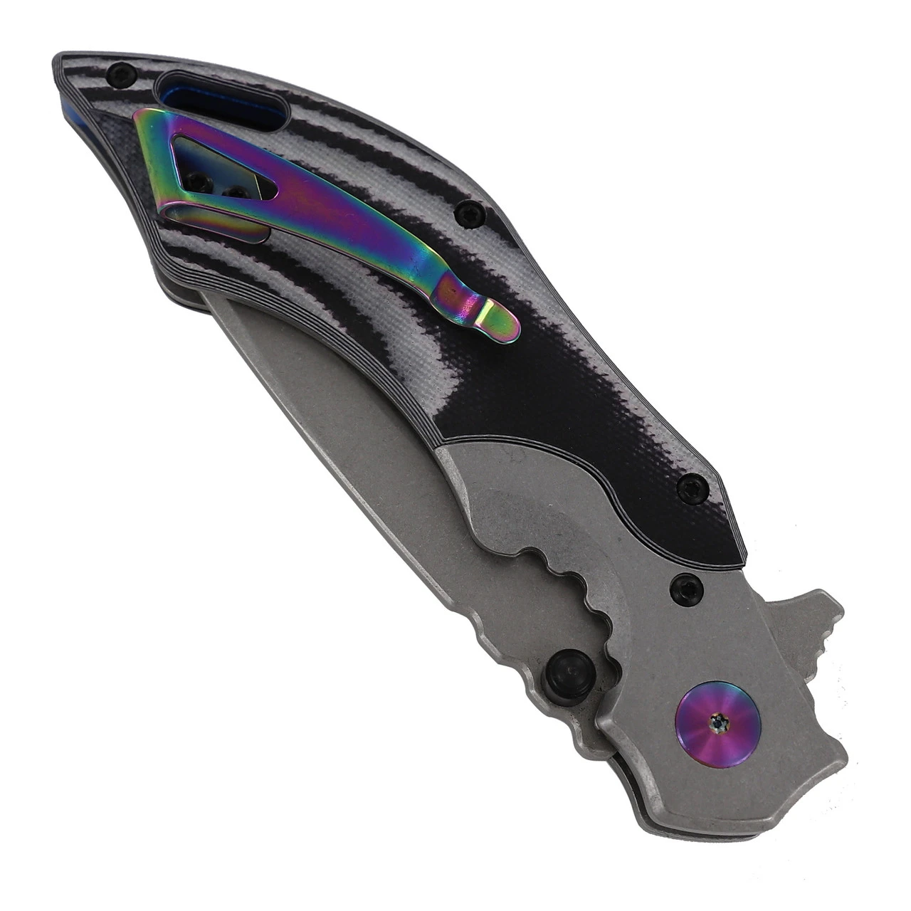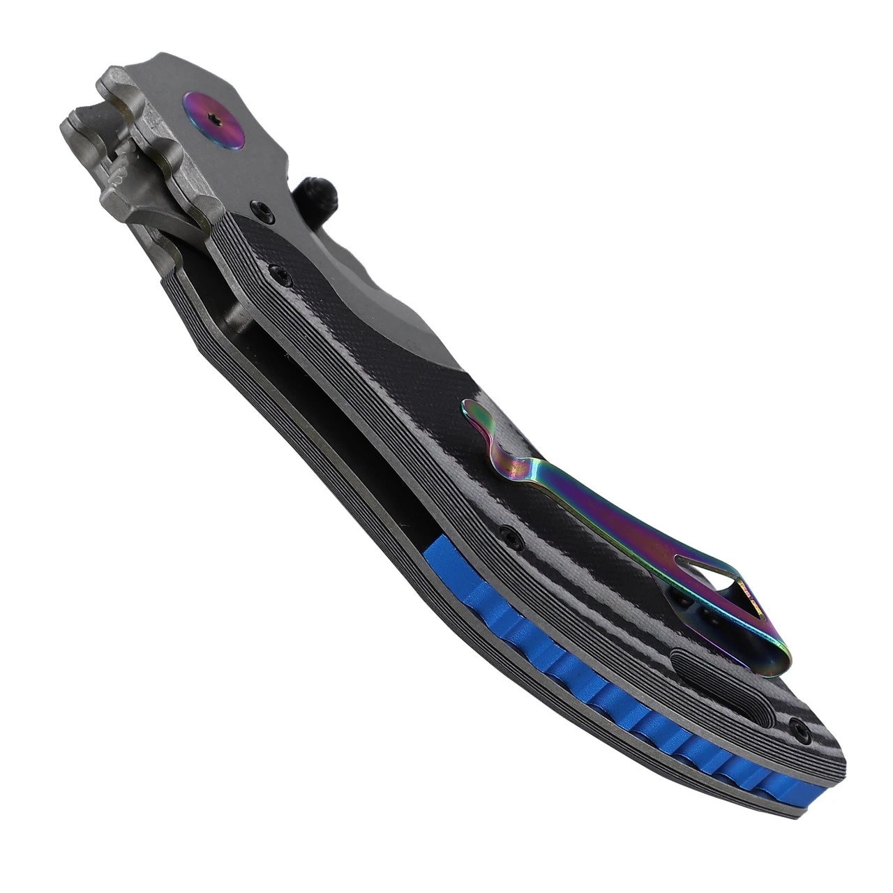 This spring assist pocket knife features a ball bearing pivot that makes opening smooth and effortless. Once you feel this for yourself, you’ll understand why this feature is so popular among avid knife collectors. D2 steel is used to create this sturdy modified tanto blade. A light stonewash finish adds to the blades already superior rust resistance, and preserves the blades original look overtime. The handle offers a double wall construction with a steal frame and G10 material plates with a snakeskin finish. The ball bearing mechanism as well as the steel pocket clip on the handle have been anodized with a titanium rainbow finish. This as well as the anodized blue ribbed spine give this tough knife a bit of color. Included with your pocket knife is a FREE black zip up carrying case and convenient cleaning cloth. Everything included with the knife, as well as the blade of the knife itself has our brand name displayed proudly, so you know it’s the real deal. Overall Length: 8.625 inches, Blade Length: 3.625 inches, HRC-58-62
