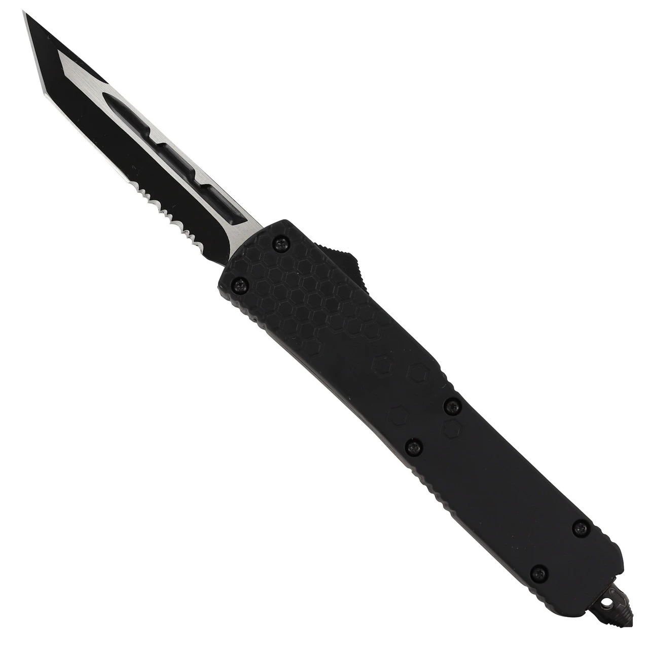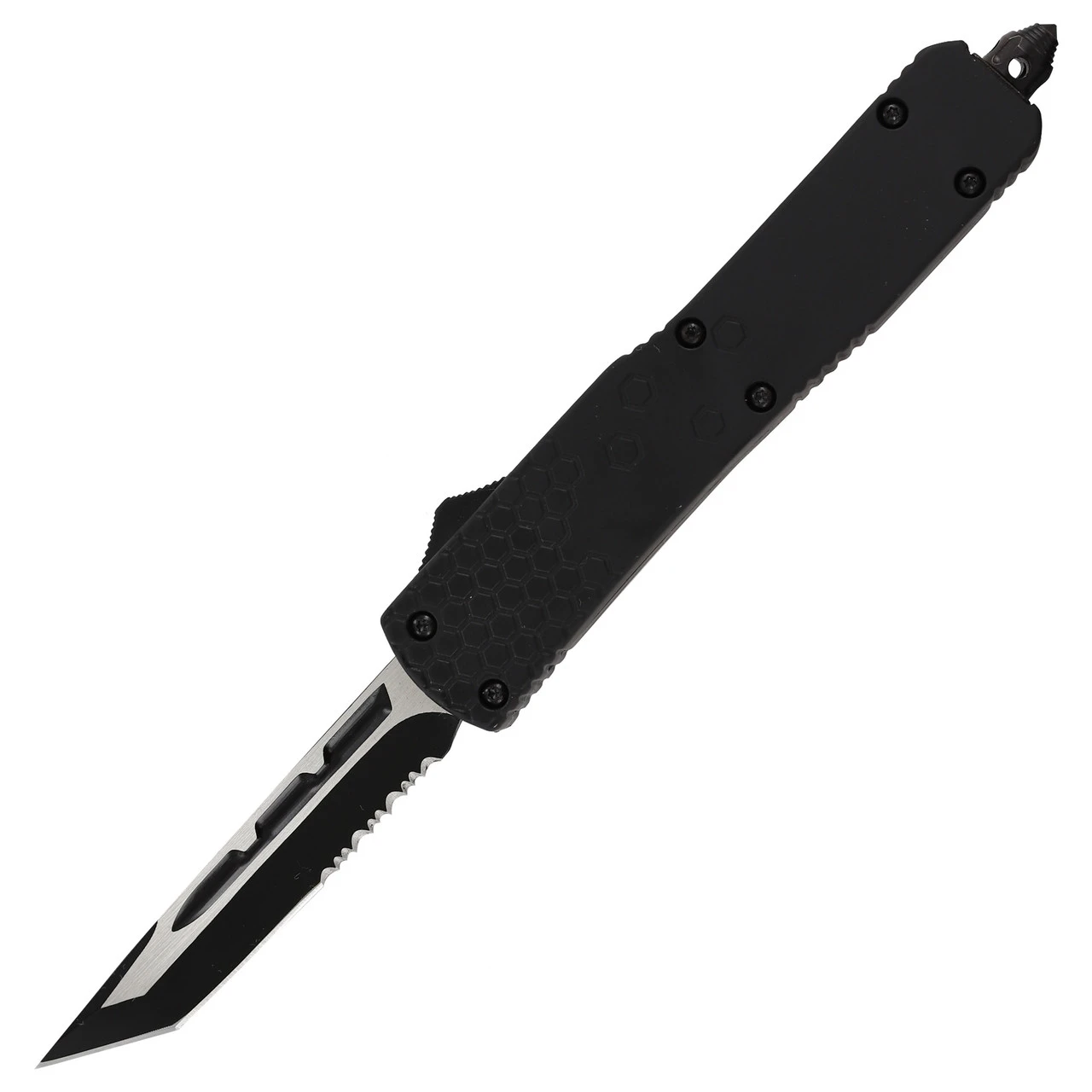 This knife has a deadly sting. The blade is made from stainless steel and comes in a wicked two-toned finish. The tanto style of the blade makes it perfect for stabbing into hard materials, and the partial serration on the belly will help grip and tear into whatever youโre up against. The handle is constructed of zinc alloy and features a matte black finish. The slender light weight design of the handle feels nice in the palm of your hand, and a hexagonal design on either side of the handle is reminiscent of honey comb. A glass breaker and pocket clip make this one hell of a knife that you can take anywhere! Included with your knife is a FREE black nylon sheath. Overall Length: 8.375 inches, Blade Length: 3.25 inches