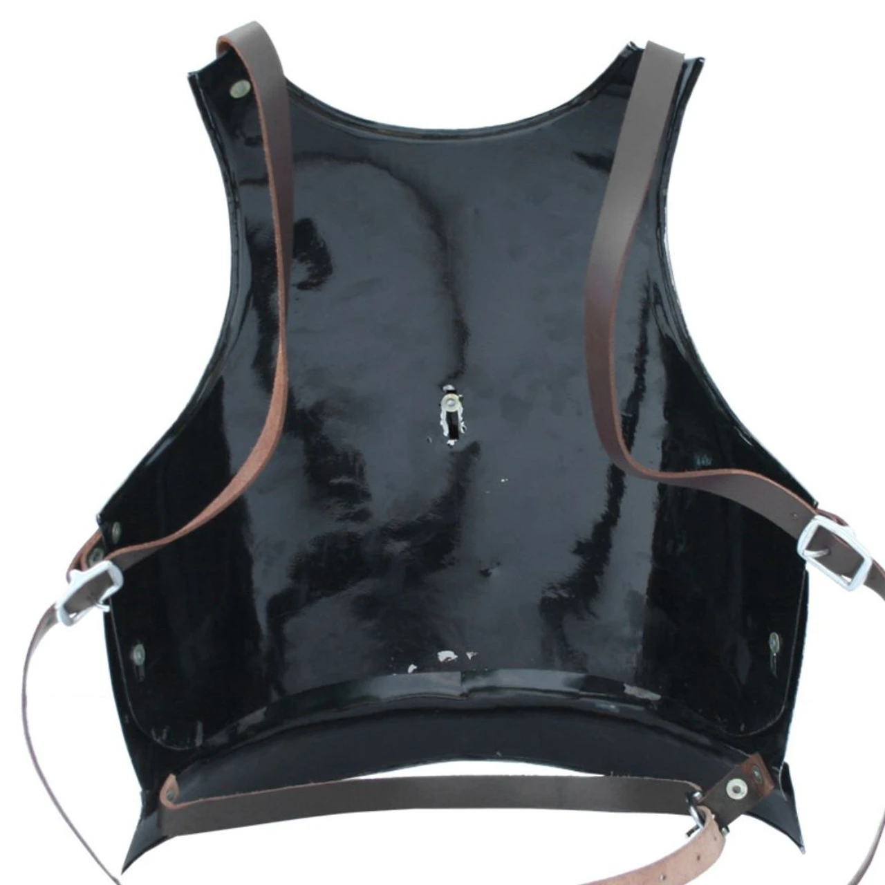 The Knights Cuirass Body Armor is made of 18 gauge thick steel and contoured around the chest area for maximum deflection. The steel sections double up the armor’s impenetrable shell. The center contour diverts an impact away from the body, protecting the armorer. The lower skirt tapers away from the armor. Adjustable leather straps comfortably support the armor from the top, down. A horizontal leather strap adjusts to your size and secures the Cuirass properly. Overall Length: 19 Inches Width: 16.5 Inches.