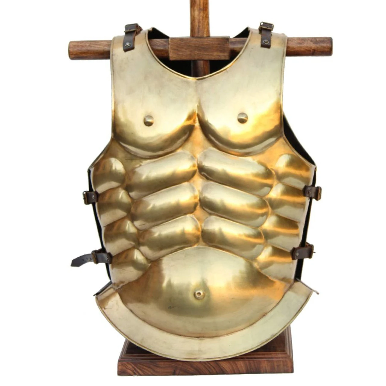 The magnificent detail and iconic look of Laels Roman Gladiatorial Arena Brass Cuirass makes it a must-have piece for any reenactor or Roman collector. It is inspired by and modeled after the legendary muscle cuirasses that Greek and Roman warriors preferred. This set includes a matched breastplate and back plate of steel that are plated in high polished brass. The breastplate is artistically sculpted to look like a heavily muscled chest, with great detail including the pecks and belly button. Two genuine leather straps on each side to accommodate multiple sizes and the shoulder piece features adjustable leather straps as well. These leather straps are well riveted to the Cuirass. If you are looking to make an impression with your next Roman look it will make anyone look like a real general out of Ancient Rome!