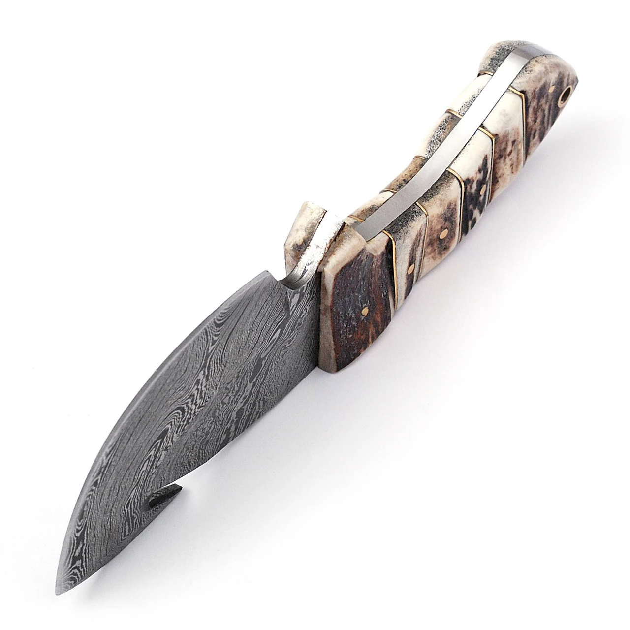 This knife is a beauty to behold. Take a look at the blade, made from a blend of 1095/15N20 steels to create a gorgeous Damascus wave pattern. The blade is not only beautiful, but also incredibly durable and able to hold a sharp edge. The gut hook feature on the blade makes this knife perfect for opening the belly of and dressing field game, making this knife and excellent companion for your next hunting trips and outdoor adventures. This knife is full tang and features a handle made from real rugged stag mounts, each piece separated by pure brass inserts. A lanyard hole at the end of the handle allows you to attach a cord or string to your knife. Needless to say, this knife is truly a piece of art and a must have in your collection. To top it all off, included with your purchase is a hand tooled genuine black leather sheath that features a belt loop and secure snap closure. Overall length: 7.75 inches, Blade Length: 3.5 inches