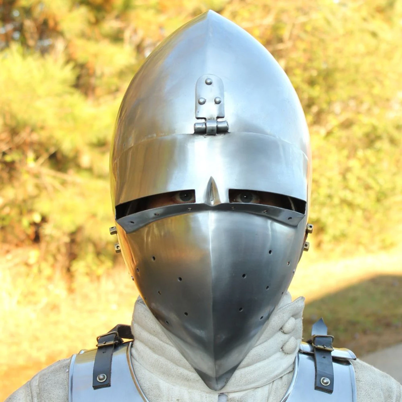 Though simple, our Medieval Bascinet Klappvisor Helmet has an effective rounded face design which aids in deflecting and dissipating the force of a strike. The hinged visor can be raised and it can also be secured in the down position with an adjustable leather strap. The helmet has brass fixtures on the bottom of the exterior that a chainmail aventail can be fitted to if desired. The klapvisor was most popular style in 14th century Germany and Northern Italy. Though it fell out of favor in Italy later in the century, the Klappvisor style visor would still be used on helmets in the German principalities into the 15th century. Constructed of 16 guage steel, this helmet is amazing for reenactments, LARPing, SCA Events, or just as a finishing touch to your costume or collection.