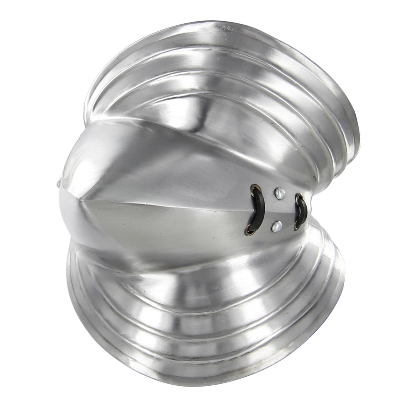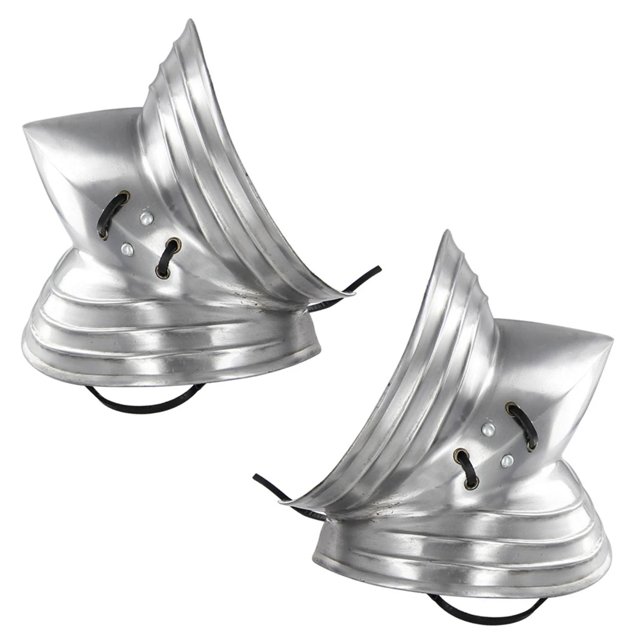 Handcrafted from 18 gauge thick steel with leather straps and buckles, this high quality piece of plate armor has been specifically designed to protect the elbows. An additional leather strap can be used to attach the elbow cups to a Chain Mail shirt for additional stability. Also known as a cowter, the curved piece of metal is molded with fluted curves to assist in deflecting blows. Four holes are included to allow for the possibility of an additional leather strap or string to be used to attach the elbow cups to a Chain Mail shirt for additional stability. Comes in a high polish finish. Overall Length: 8 Inches Width: 7.5 Inches Weight: 1.5 Lbs Steel Gauge: 18G Fitment: Adult Sizes Features: Adjustable Leather Straps
