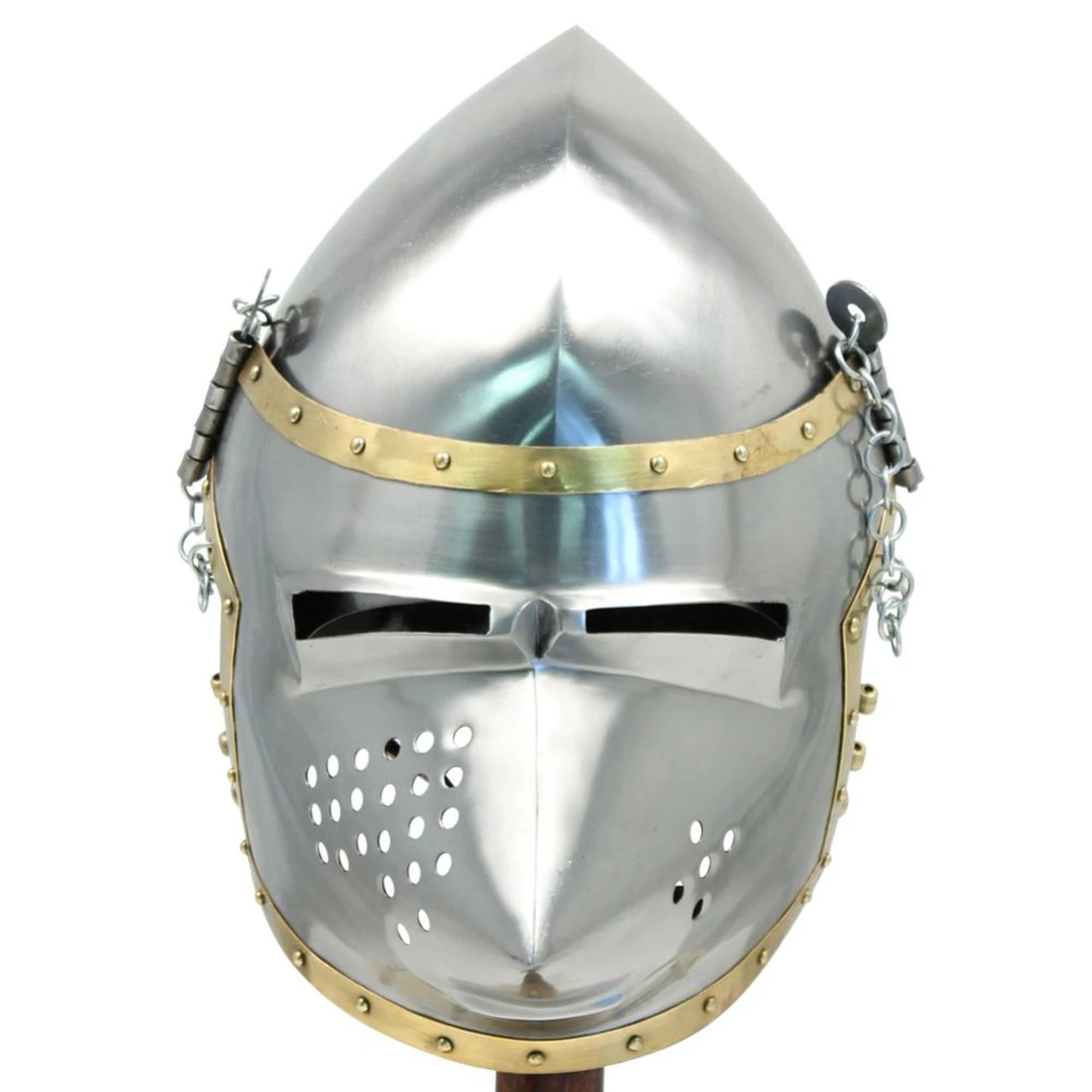 Popular for its close-fit styling, the bascinet began replacing the great helm in the late 13th century with the conical pigface design intended to direct blows down and away from the skull and face of the knight. Hand-forged from high quality 18 gauge low carbon mild steel and adorned with brass accents, the helmet features a versatile side-pivot mount system which allows the visor to be completely removed if desired via detachable hinge pins to each side of the helmet. The visor features 28 breathing holes for ventilation along with wide eye slits to ensure high visibility by the wearer. A fully adjustable interior lining is made from high quality 100 percent genuine leather and ensures that the helmet has a comfortable fit