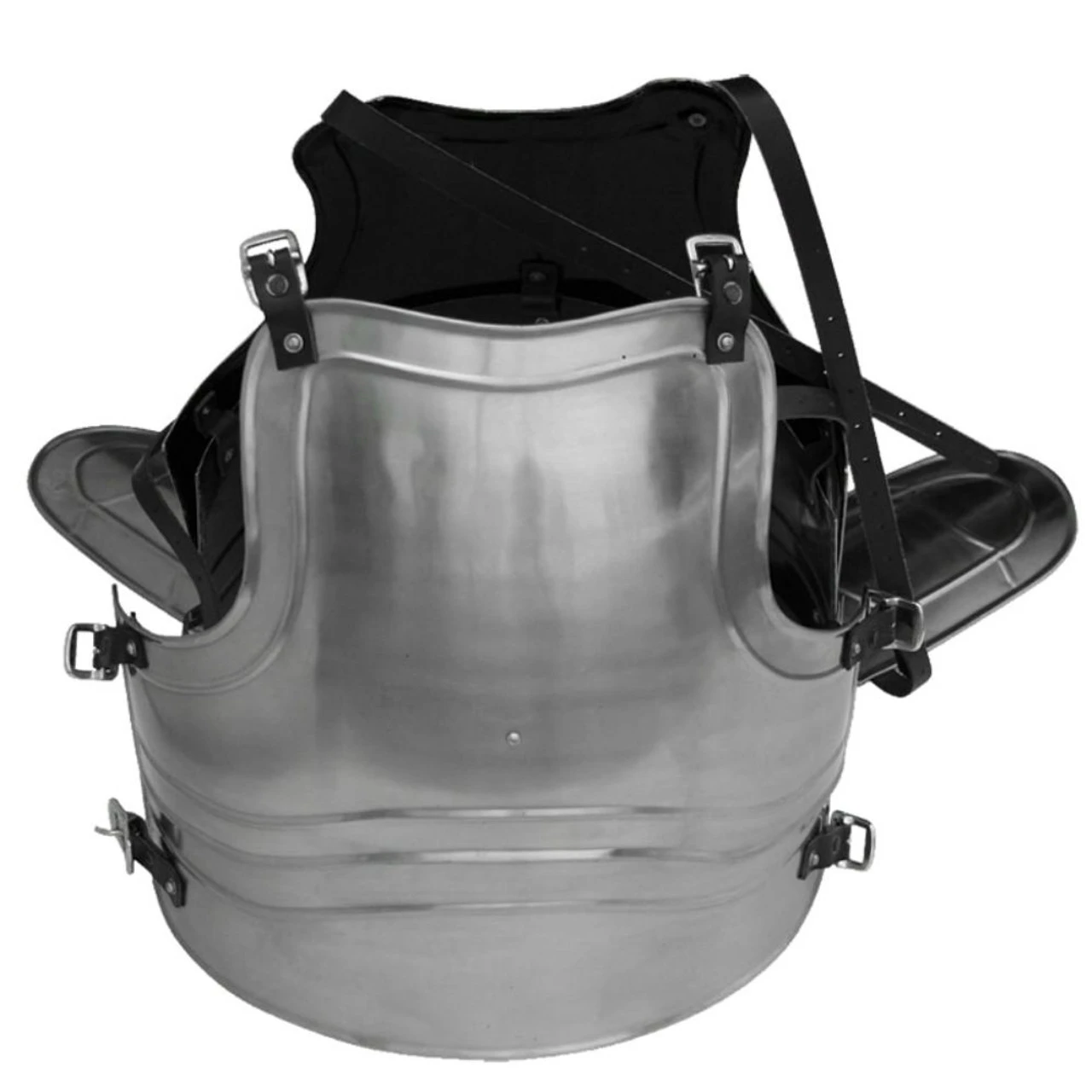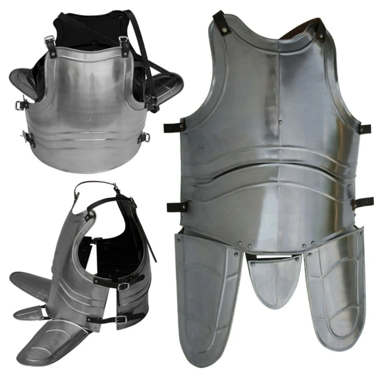 This Knights armor consists of the Cuirass (chest & back armor) and the Tasset or Skirt of Tasses (upper leg protection). Each piece of armor is made of 18 gauge steel. The sections are suspended by comfortable leather straps that adjust to any size. At the sides of the armor you can adjust the straps to fit any width. Each cuirass side is sectioned into two protective layers, linked together with thick leather straps and steel rivets.
