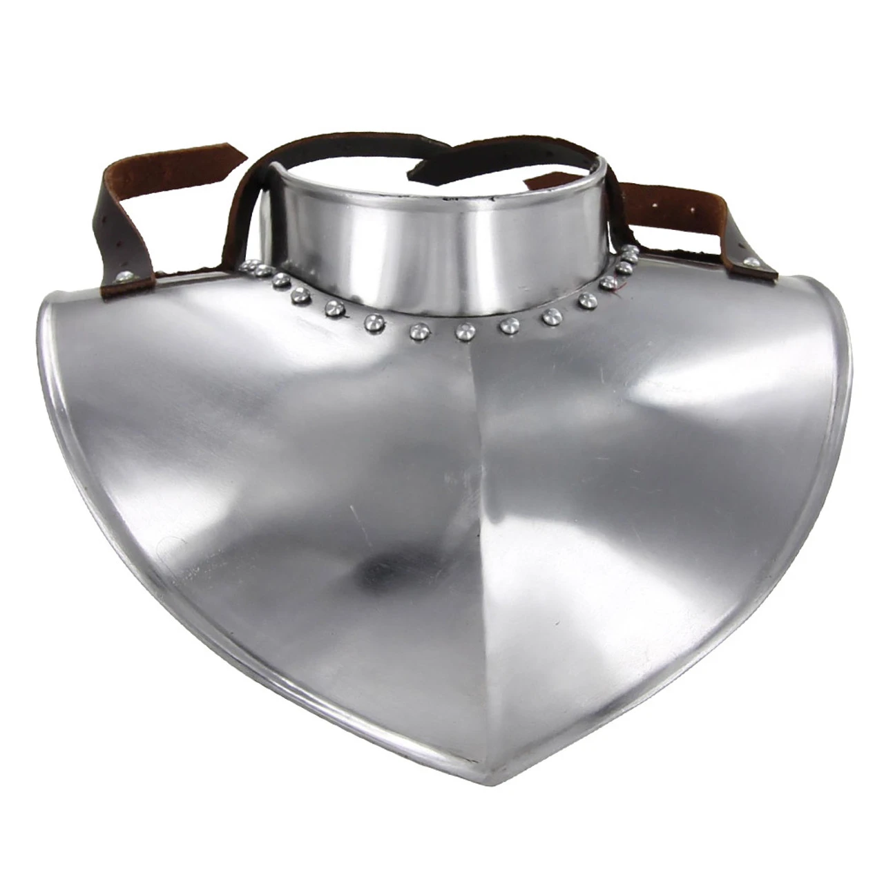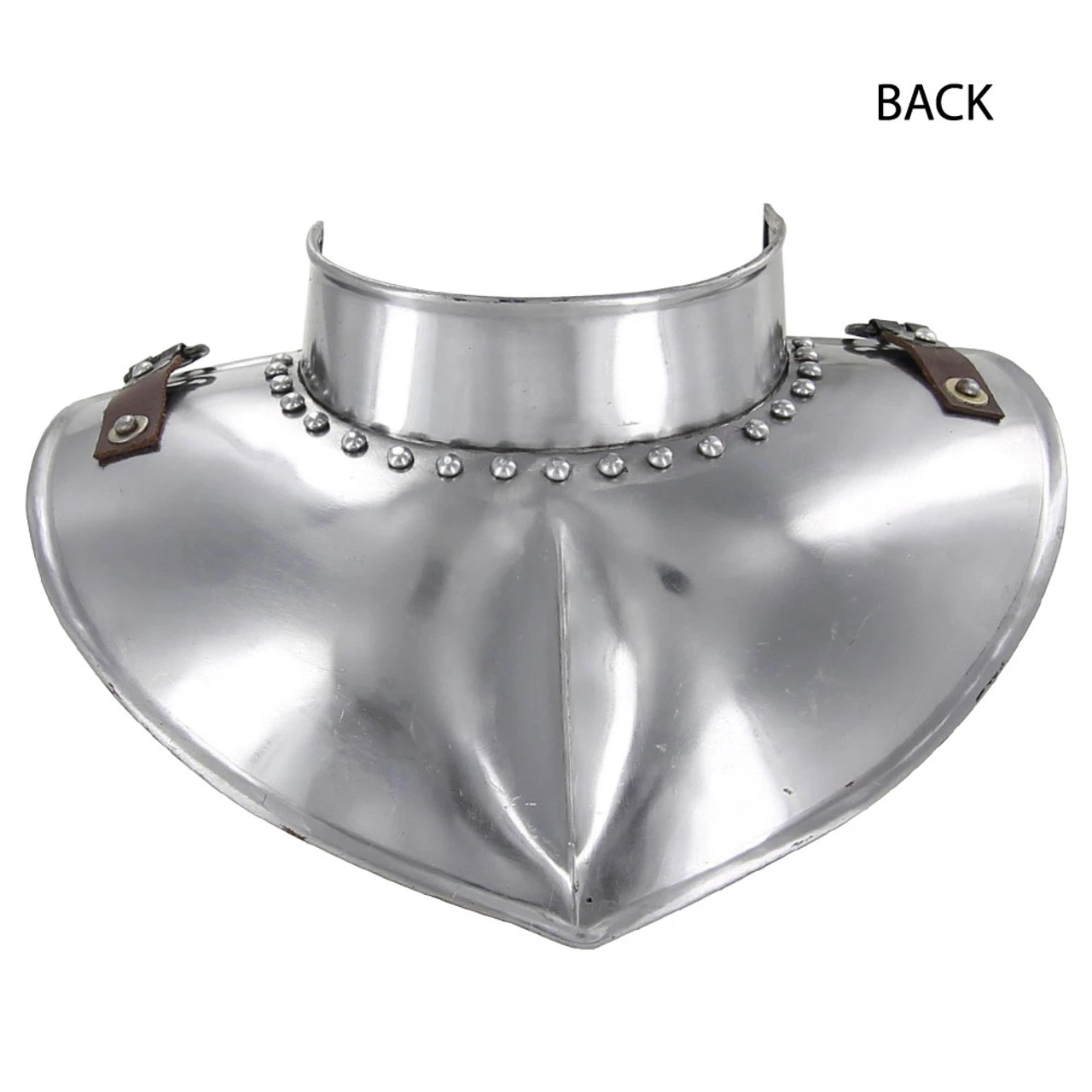 Handcrafted from 18 gauge steel and featuring a shiny metal finish, this gorget consists of two separate plates connected by genuine leather straps. The collar attachments are attached via steel rivets. Length: 13 Inches, (Front) 9.5 Inches, (Back) Width: 12.5 Inches, (Front) 12.25 Inches, (Back) Weight: 3.95 Lbs (Total), Features: Adjustable Leather Straps.