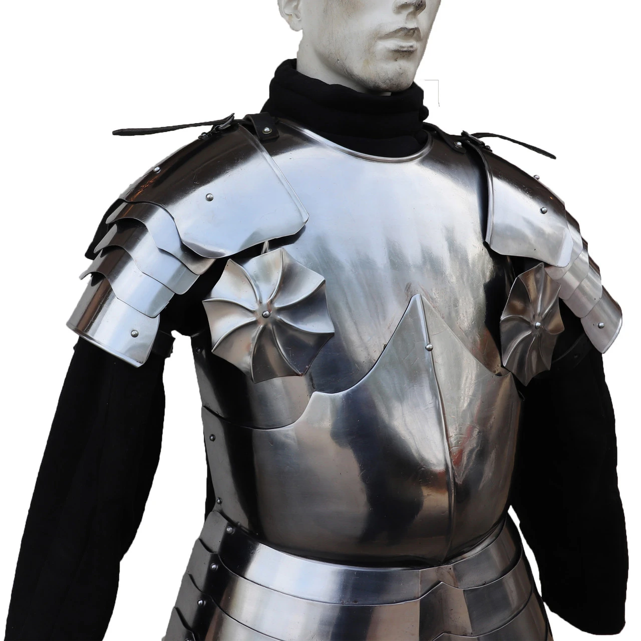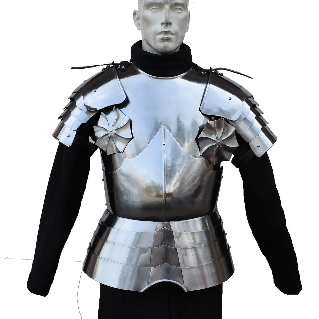 Protect your torso with our Medieval Warrior Knights Crusader Cuirass Chest Plate. This cuirass is forged from 18-gauge mild steel, so it is lighter weight but still protects you from heavy blows. This makes it perfect for LARP, SKA, HEMA, or cosplay. The breastplate is made into two parts; the lower adjusted to overlap the other, held together with three sliding rivets to add flexibility to the plate armor. This makes it easier to bend. Faulds are riveted below the breastplate to protect the waist and hips. Adjustable leather straps are added so you can get the most comfortable fit possible.