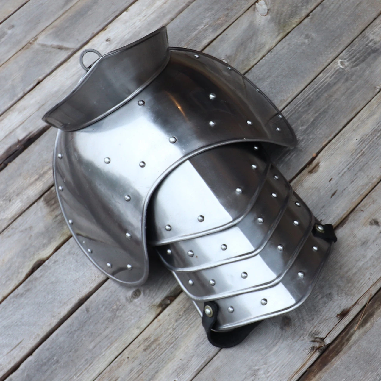 These armor pauldrons are made to protect you from even the mightiest of blows. Made from solid 18-gauge steel, this replica armor is made to be worn and used. Adjustable leather straps go around the arm, and the buckle on the op of the shoulder is provided so you can attach the pauldrons to your gorget (not included). Sword breakers have been added to the shoulders to provide extra protection. The four rivets under the solid shoulder plate allow better movement. Add this to the rest of your warrior armor to form a badass impenetrable barrier for your next medieval-themed outing. Overall Length: 17.75 inches, Overall Width: 19 inches