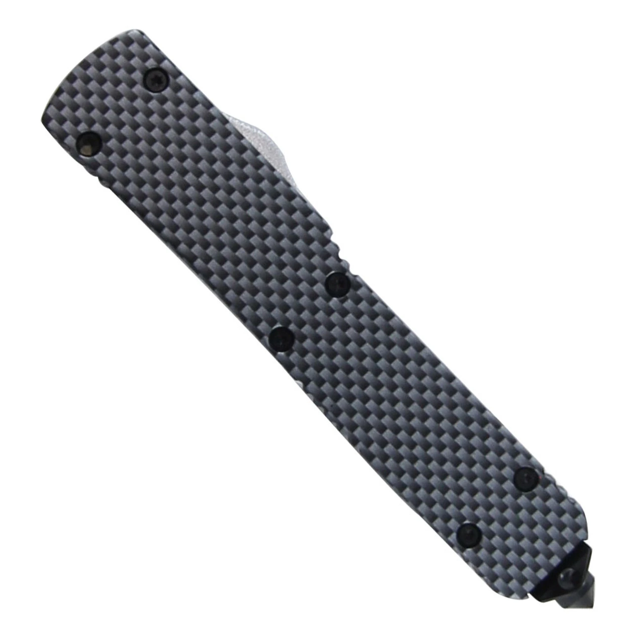 Arm yourself with the ultimate protection that is an Out the Front knife. Out the front knives are great because they provide immediate security with just the push of a button. This OTF in particular is a double action, meaning that you can eject and contract the blade with the same button instead of manually having to close it. Not to mention the all-around badass look this knife already has. The blade is forged of stainless steel with a spear point style and menacing two toned finish. If that isnt enough to seal the deal, just look at the handle. Made with incredibly durable zinc ally and a carbon fiber finish and glass breaker on the tip, whats not to love? To top it all off, you get a cool nylon sheath to tote this bad boy around in. Overall Length: 8.38 Inches