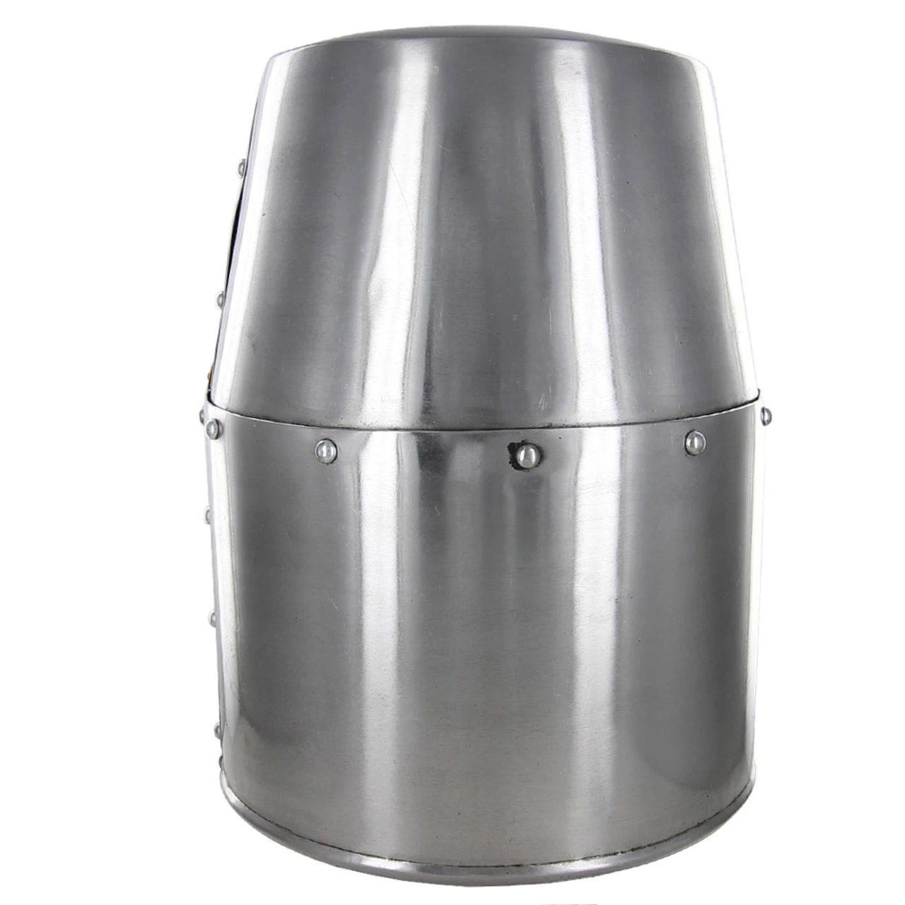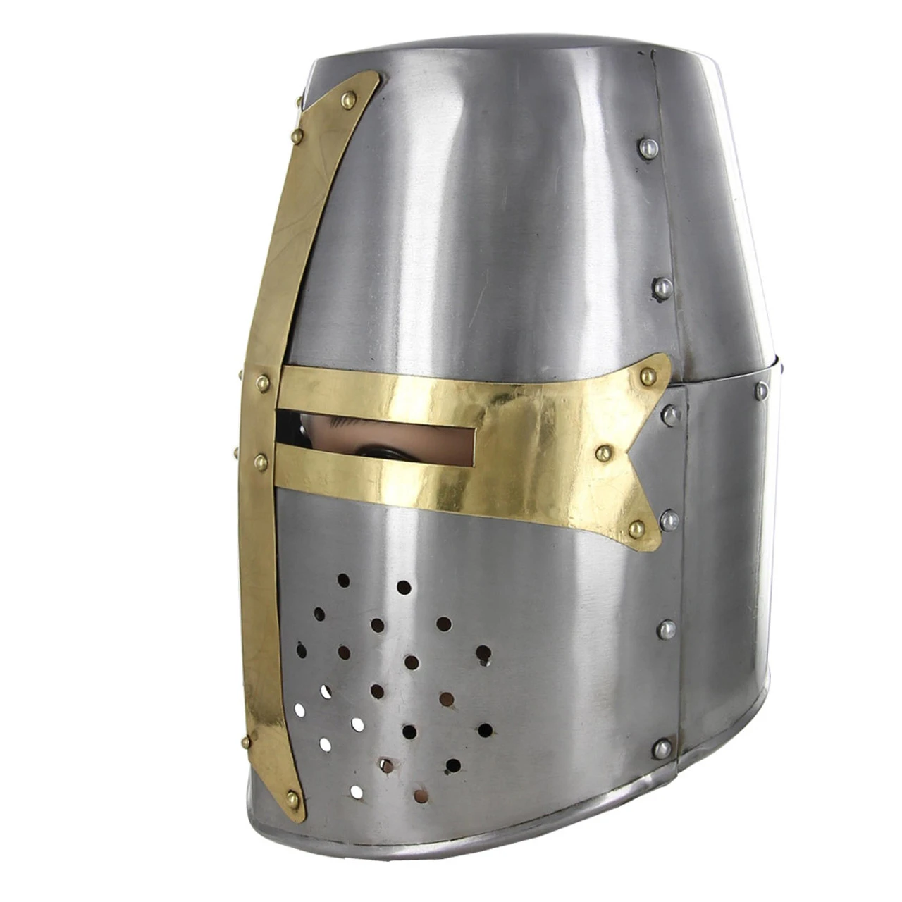 The great helm is today especially popular amongst live-action role players and in medieval re-enactments. This type of helmet was great as it provided good protection for the head against both sharp and blunt weapons. Knights usually wore the great helm over a mail coif sometimes in conjunction with a close-fitting iron skull cap known as a cervelliere. This great helm is constructed of hand-forged 20 gauge steel with an interior leather lining with chin straps and a brass buckle. This helm has menacing narrow eye slits and a ventilated face guard for maximum protection. A beautiful brass cross adorns the center of front and stretches top to bottom and side to side. Each piece has been riveted to the frame of this helmet making it a durable and solid piece. Inside a leather suspension liner is provided for comfort and includes an adjustable chin strap with buckle. To prevent rusting and prolong the life of the helmet it comes oiled.
