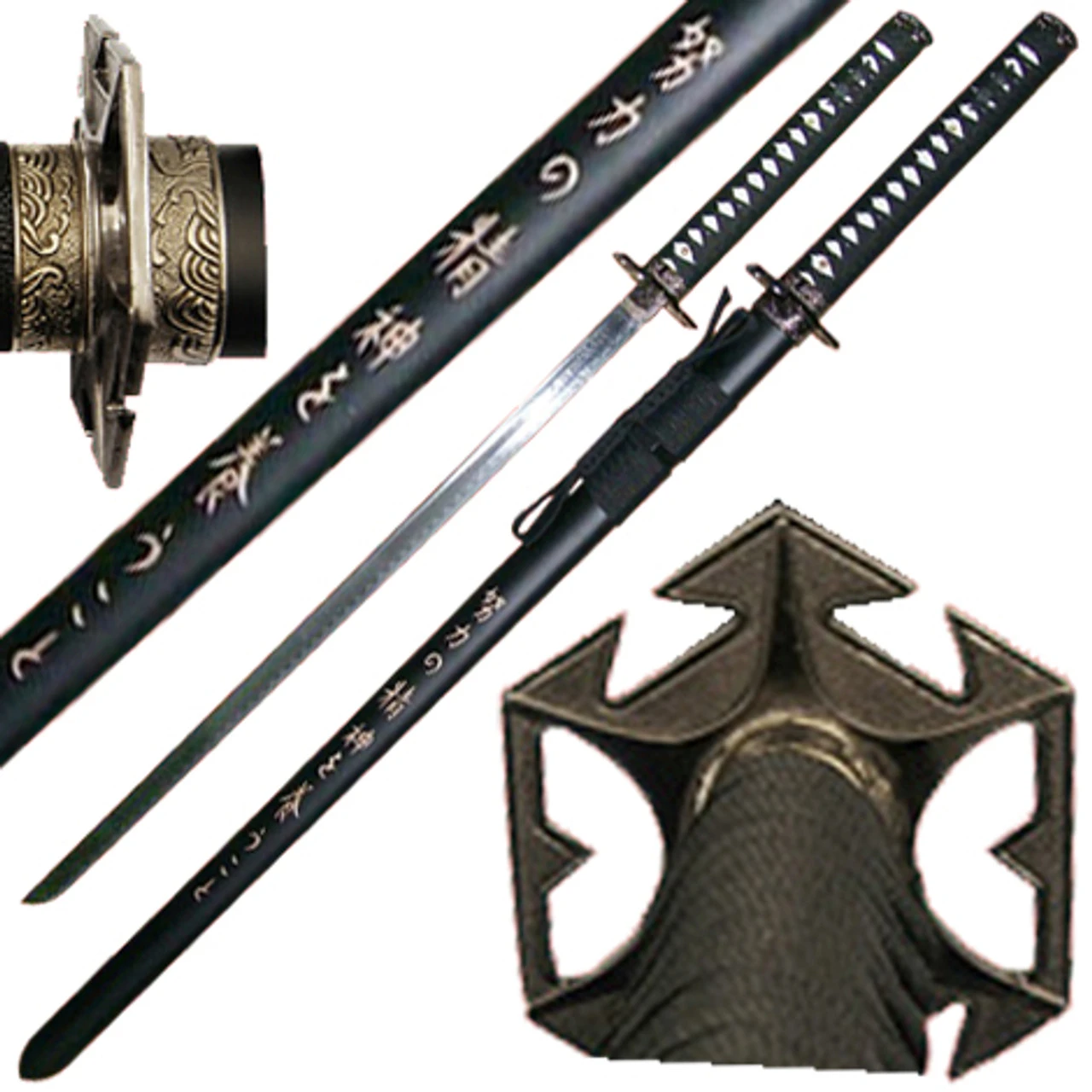 This sword carries a carbon steel blade, sharp with a hamon. The handle is black nylon cord wrapped with faux black ray skin and traditional gold Menuki. The Pommel is much decorated matching the habaki. The scabbard is made from natural wood with black solid paint and carries the traditional nylon cord bull horn. The scabbard also has the Japanese traditional writing, the mark of the samurai. Overall Length: 37.5 Inches.