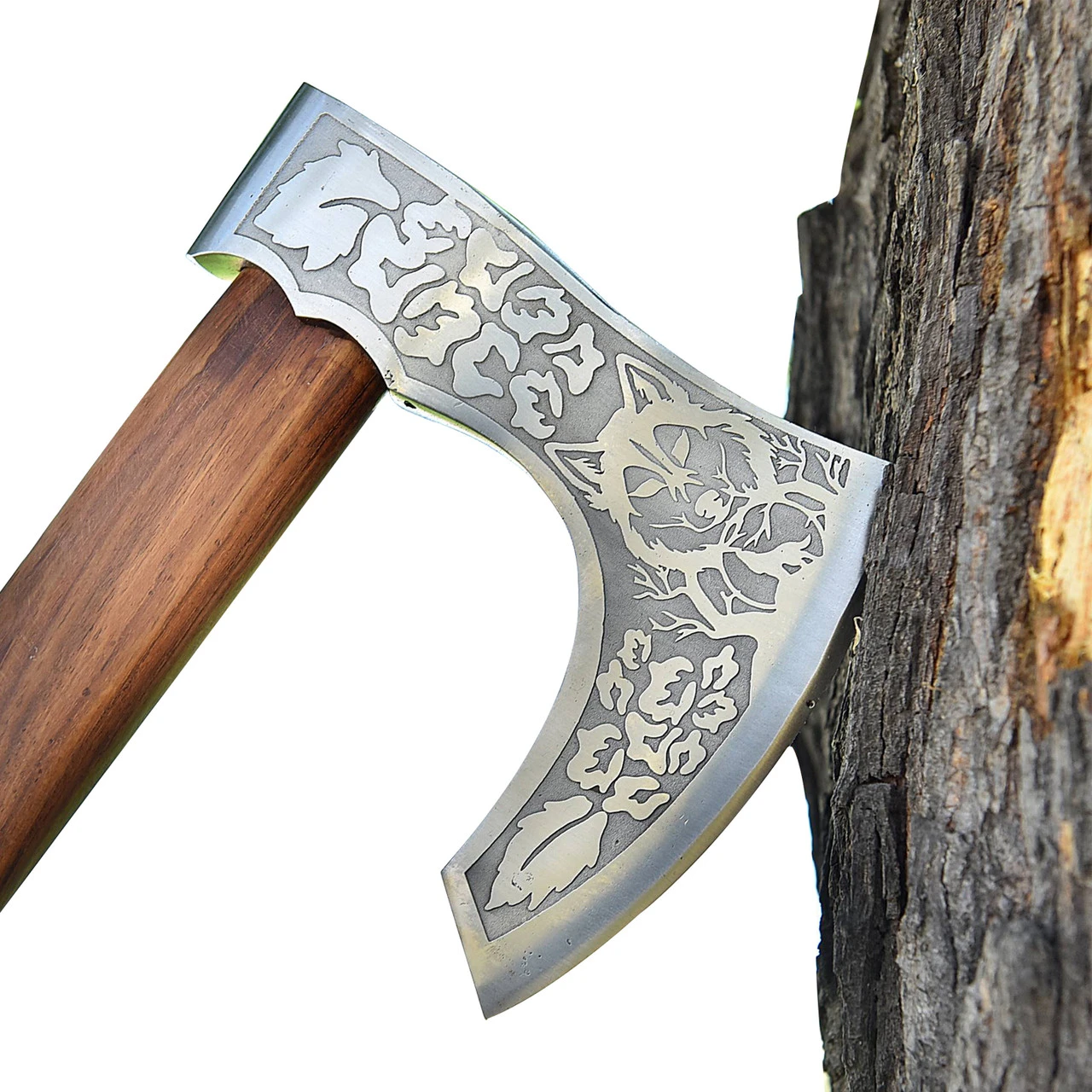Sometimes you just need to get away from civilization and rough it in the woods. Not too rough, though; be sure to bring your axe! Our One With Nature Outdoor Axe has got you covered for all of your outdoor needs. The head of the axe is constructed from high carbon steel and in a traditional bearded style. The beard provides a wider cutting edge while maintaining a decent weight. Etched onto the axe head is a majestic wolf surrounded by foliage. The handle is made from durable sheesham wood that just feels nice in your hand. Included with this axe is its very own sheath made from genuine cowhide leather and features three secure snap closures as well as a belt loop for easy carry. Overall Length: 20 inches, Blade Length: 5.5 inches