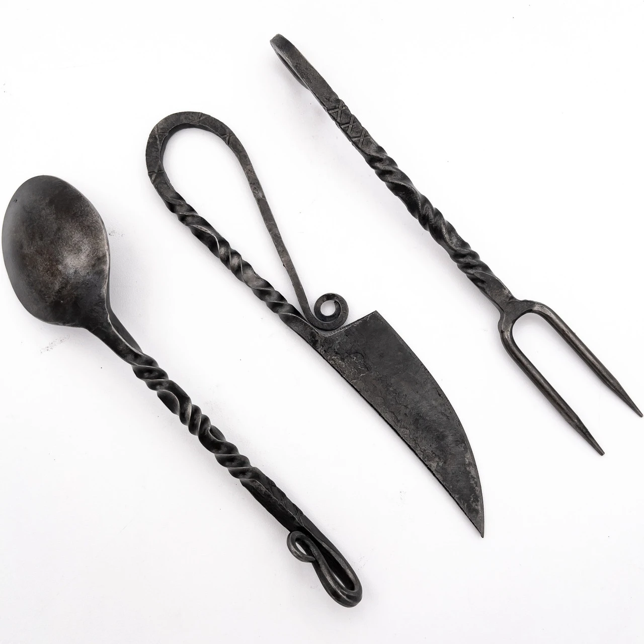 The Orange Glow 3PC Set Medieval Iron Silverware Fork, Spoon, and Knife came from the fires of the forge to rest in the orange glow from your hearth at the table. This is a three-piece set containing a fork, spoon, and a knife that are composed of forged iron. The handles of each are twisted into an elegant loop at the end and the base of the handles themselves are twisted. The loop at the end is the only part of the handle that is not twisted; instead, there are x-shaped grooves cut along the sides of the end of the handle that is flat instead of twisted. The Orange Glow 3PC Set Medieval Iron Silverware Fork, Spoon, and Knife is a full three piece cutlery set that is a breathtaking and stunning addition to any kitchen.