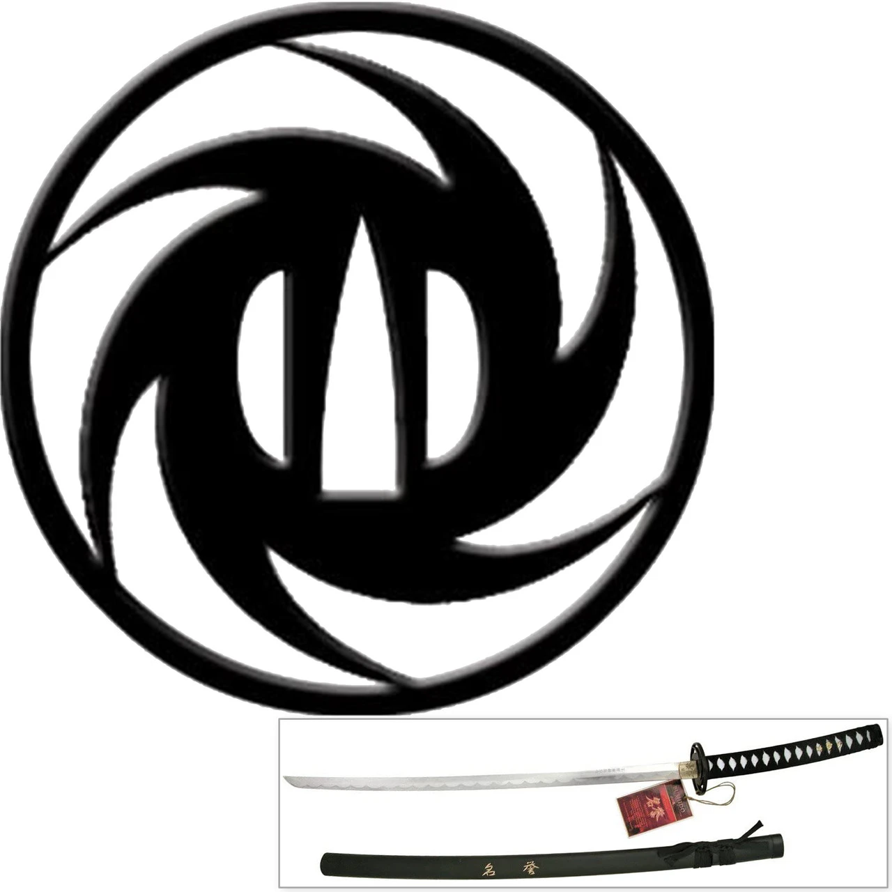 This replica Samurai movie sword features a 26-inch blade constructed of 440 stainless steel with a gleaming polished finish. Laser etched into the blade are the Japanese Kanji as well as a detailed Hamon design. The handle is made from wood and features faux ray skin wrapped with black rayon in a traditional Japanese style. Included with this sword is a matte black scabbard that has been hand carved with the Kanji for “Honor”.
