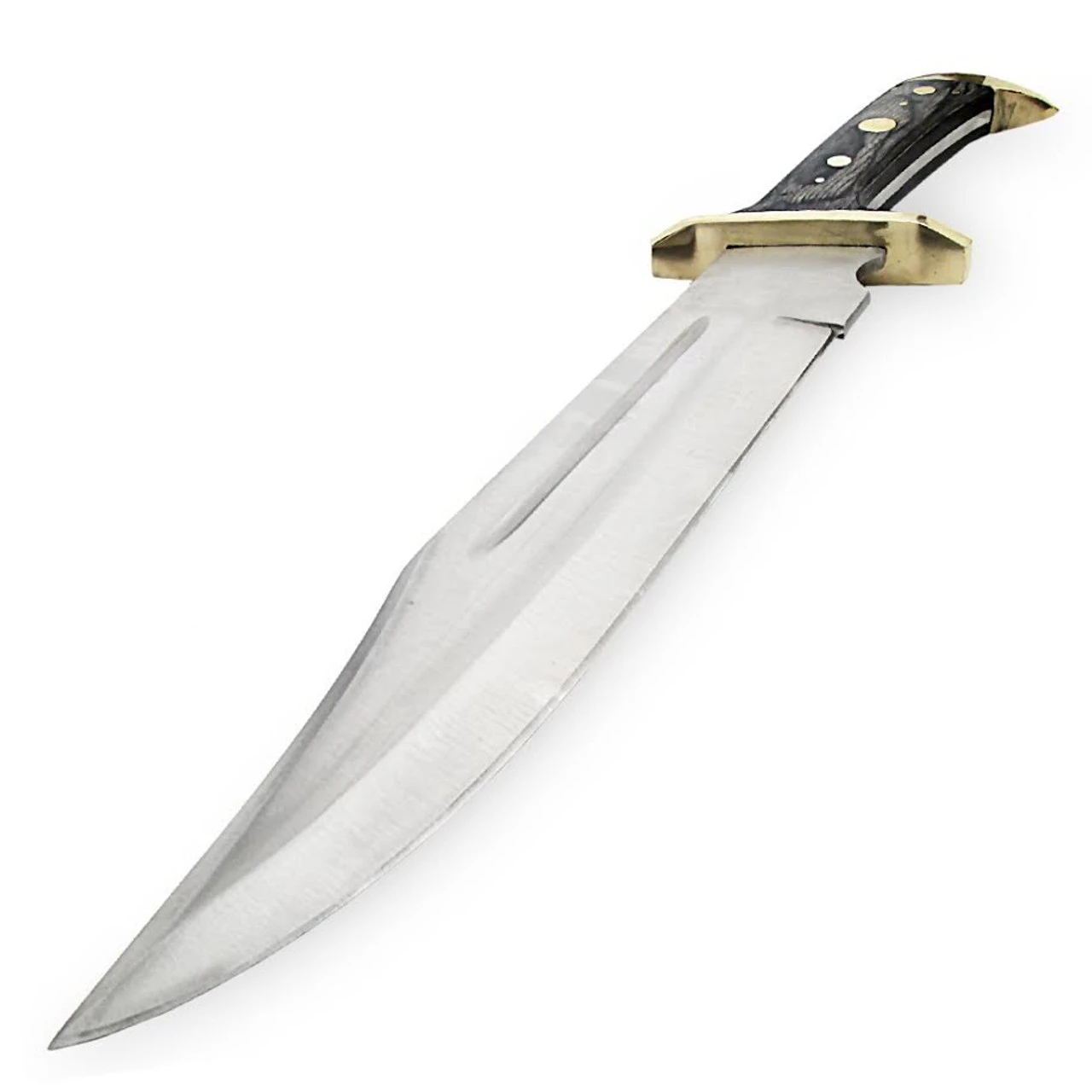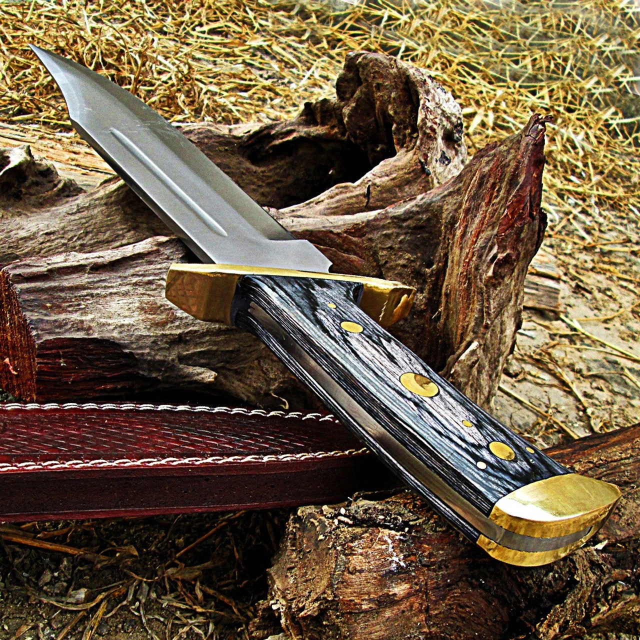 This knife is large and in charge with its massive handle and blade. The handle is full tang with wooden mounts stained in a lovely gray and sealed. Brass accents compliment the handle and match the large 4 inch guard. This blade is not only broad but it is heavy and weighted in your hand the way a knife should be. This Bowie is constructed of a 440 stainless steel in a trail point style with a satin finish. Great for hunting as the sharpness of the blade makes skinning very easy. Besides hunting there are many avid Bowie collectors that would love to get there handles on this beauty. Included is a rather comprehensive leather sheath that comes with a belt loop and snap closure. Tooled in the front and made of thick durable leather how could anyone ask for anything more?