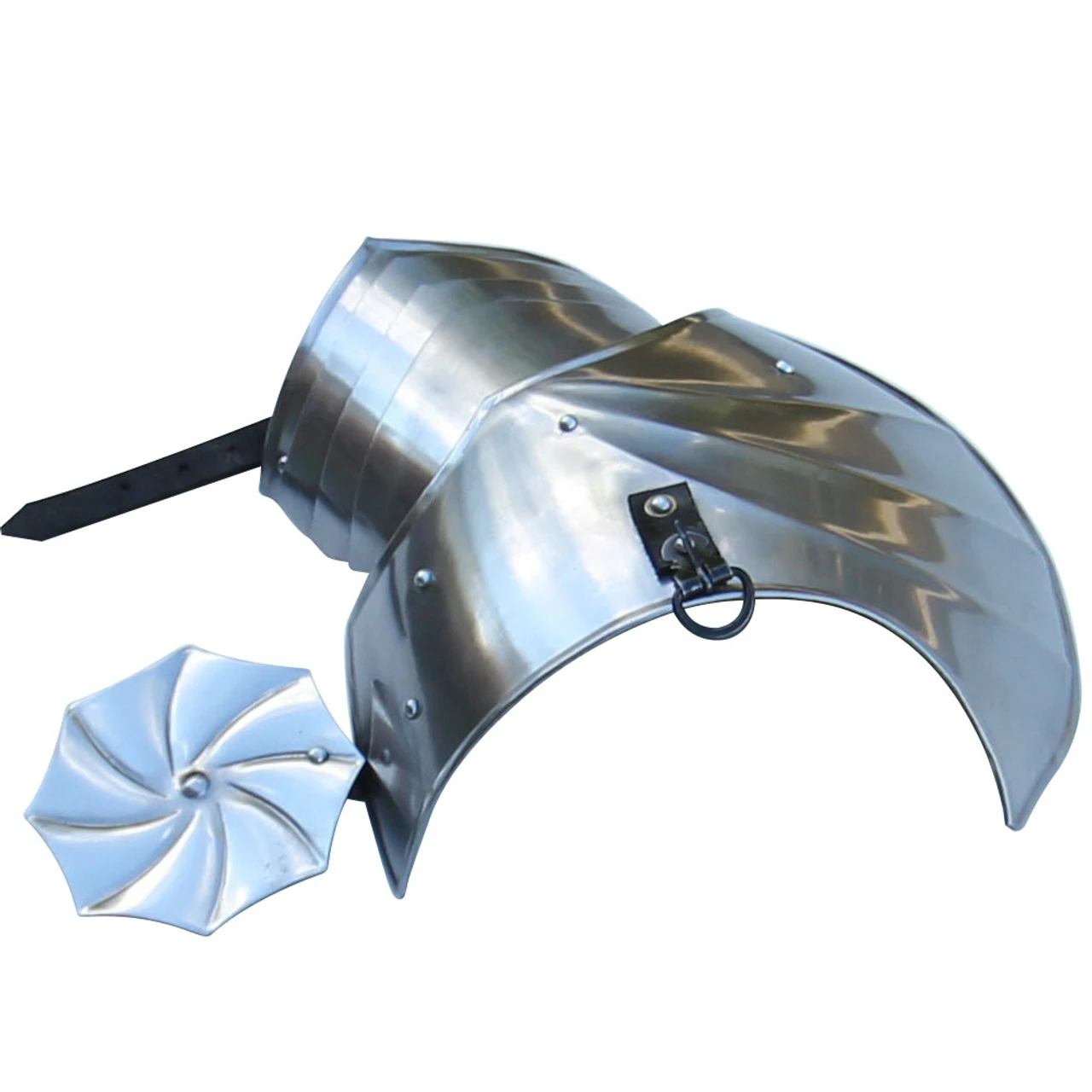 Handcrafted from 18 gauge mild steel then polished this set exudes power like any armored knight should. Four lames are rivets to a much larger asymmetrical dome shoulder cop of the plate armor to protect the upper and lower shoulder on each side. Attached by leather straps to the cops are rondels made from the same material to protect the vulnerable armpits. Overall Length: 14 Inches.