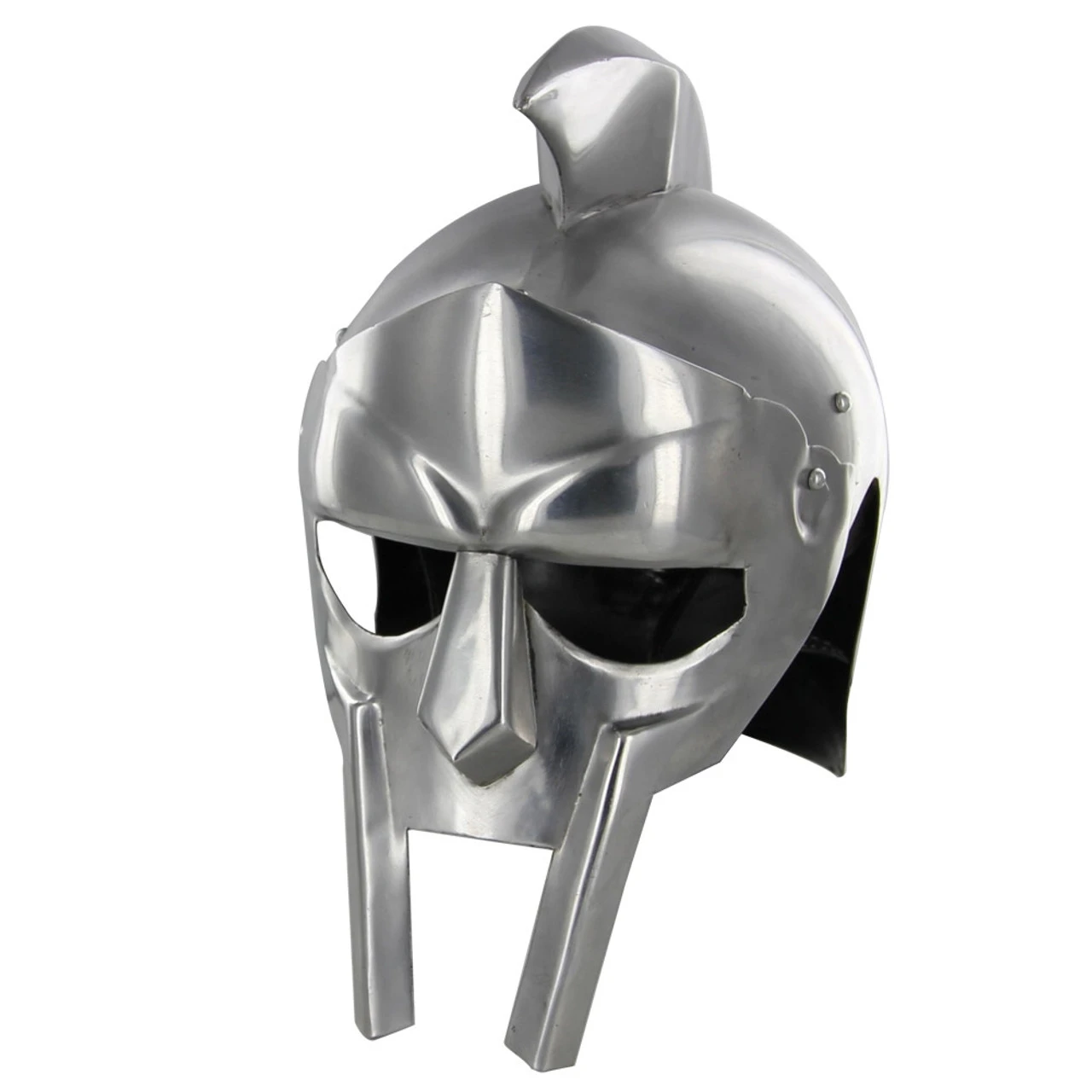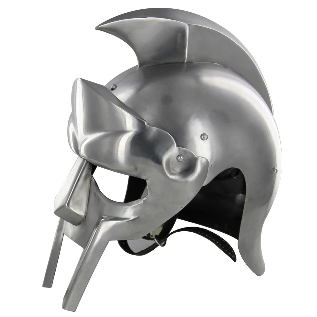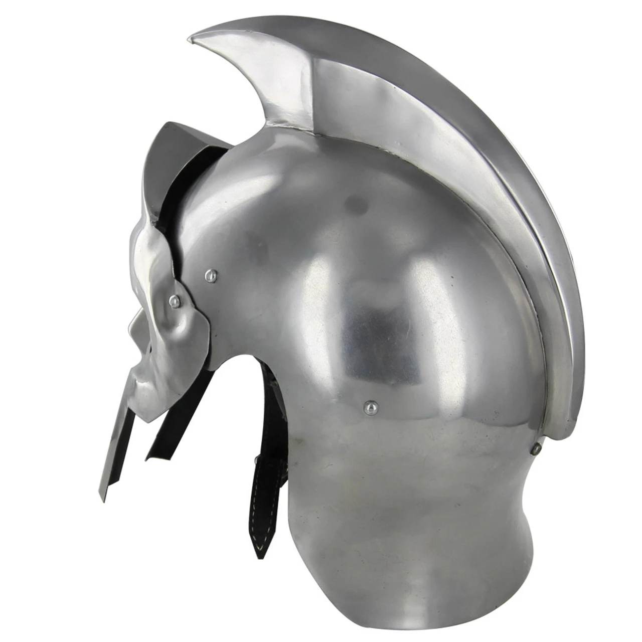 Carbon steel, 20 gauge thick, makes this functional Gladiator helmet strong and durable. The top of the helmet has a steel plume forged to it. The plume stretches from the back out to a point at the front. On the front of the helm is a functional bassinet used to protect the face. Leather lines the inside with a smart adjustable suspension for soft and natural comfort. A leather chin strap can be adjusted to fit all sizes.