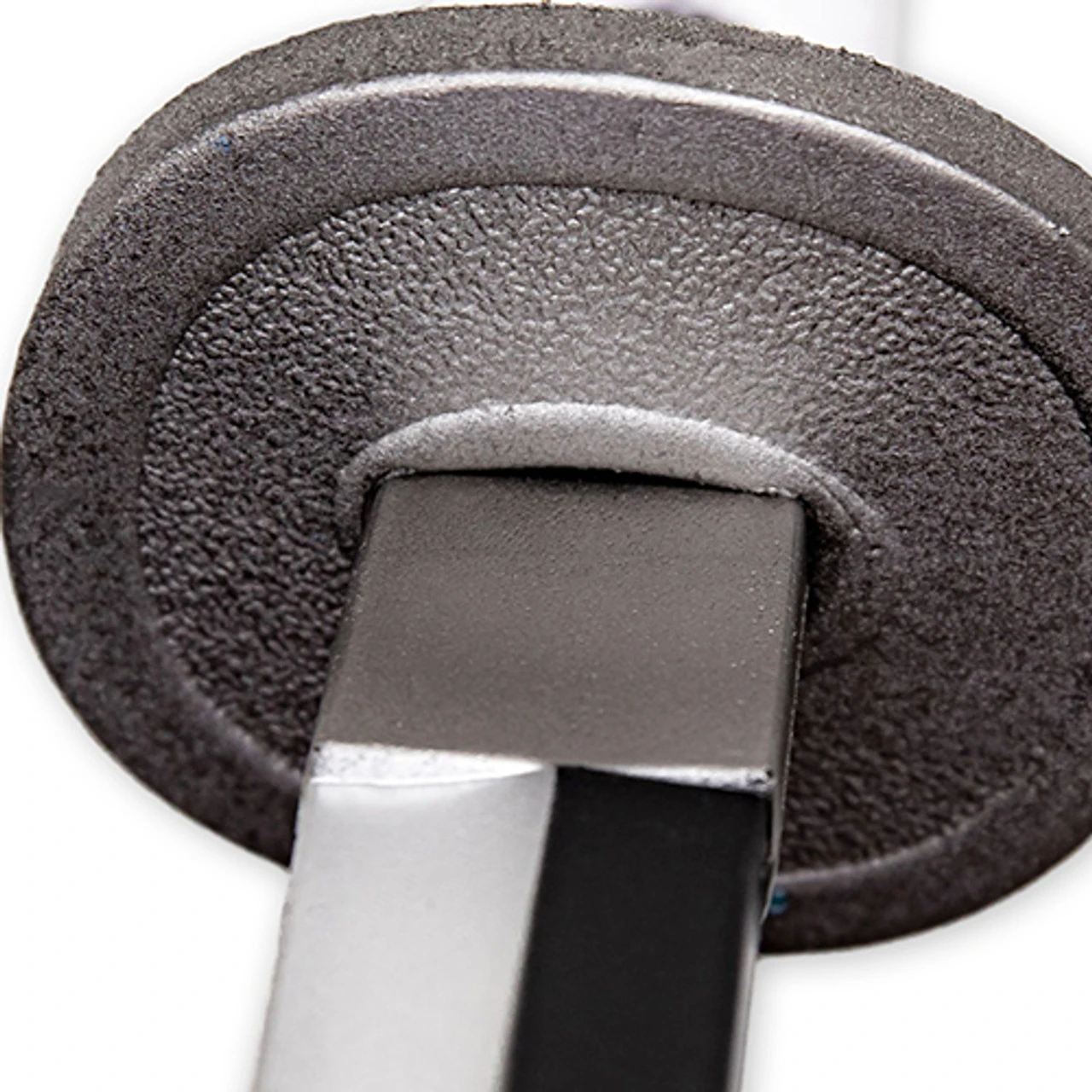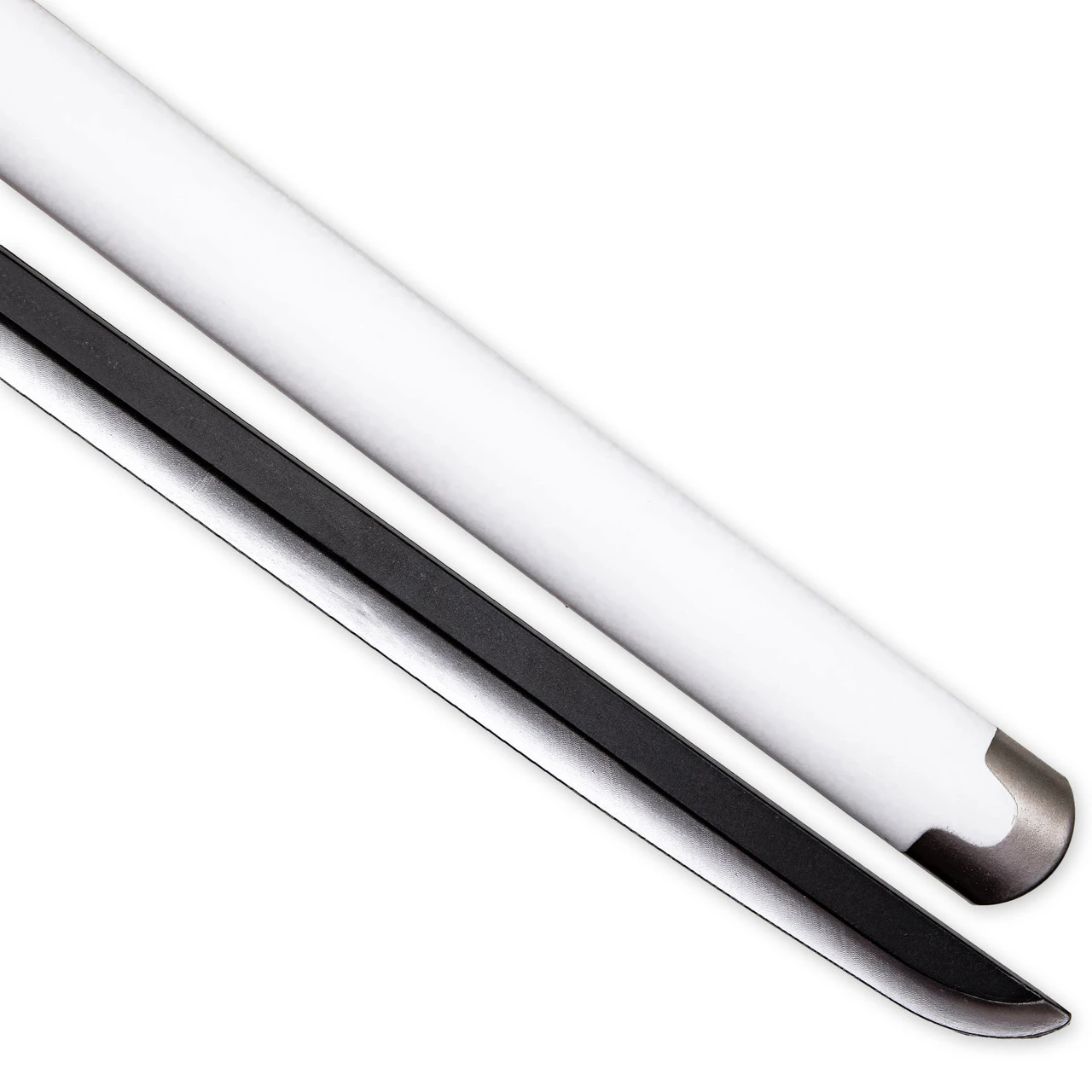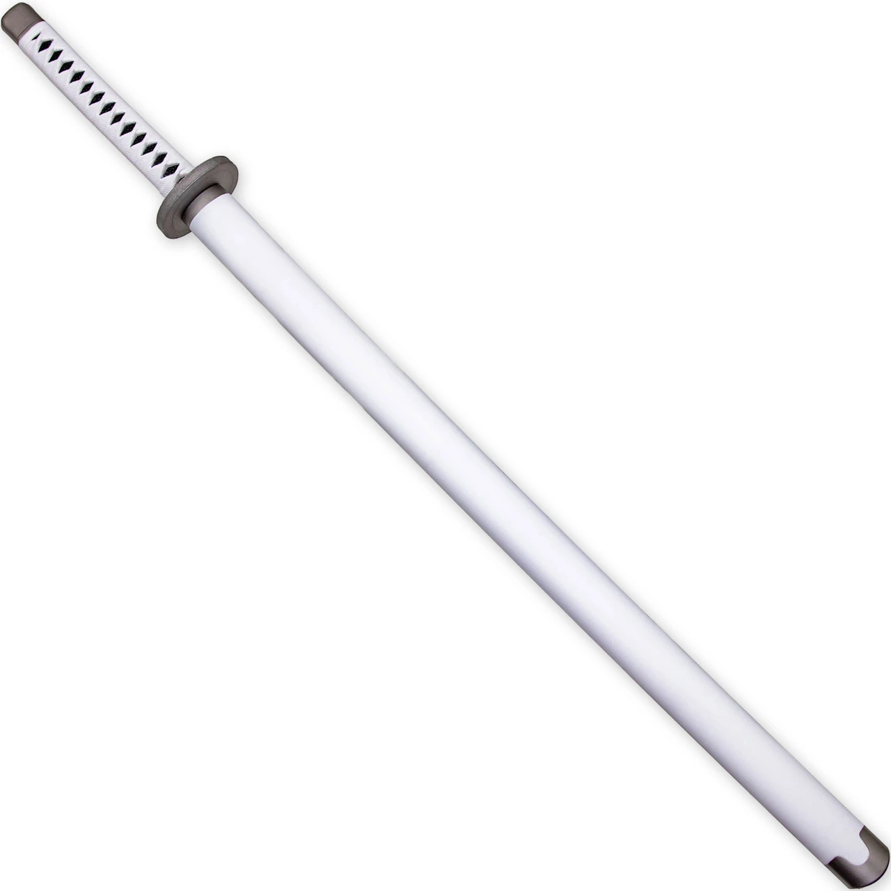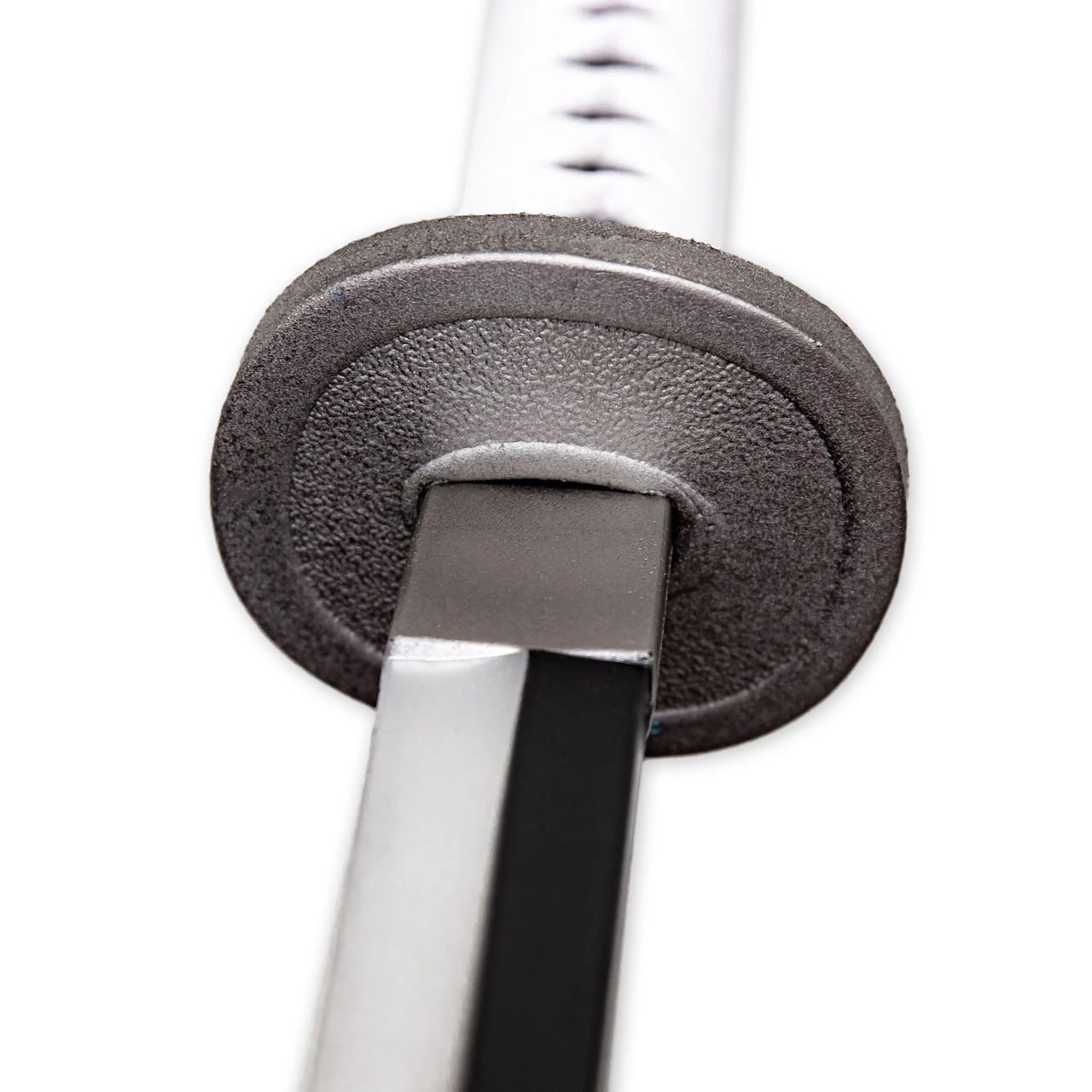 This replica may be made of foam, but it is certainly no childrenโs toy. This Wado Ichimonji katana sword is composed of polyurethane foam and features a 10 mm fiberglass core. Polyurethane foam is both durable and flexible, and the added fiberglass core creates a strong sword that can be used for cosplay as well as kicking bad guy butt in mock battle. The handle is molded to resemble a traditional Japanese wrapping in white cloth, and an underlayer of black ray skin. The circular silver foam hand guard (or Tsuba) comes detached and assembly is extremely simple. A mock habaki separates the blade from the handle. A fully white scabbard composed of hard plastic is included with this sword so you can safely carry your new prop around your next convention.