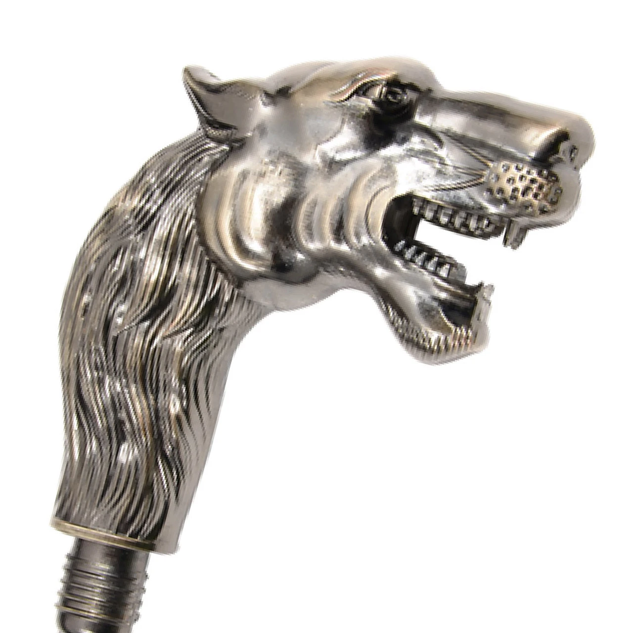 The handle is a head of a lioness bearing her teeth with a brushed metal finish. The zinc aluminum handle has impeccable detailing right down to the whiskers. The shaft is constructed of steel with a black finish and an aluminum collar. The shaft conceals a durable 12.25 inch 440 stainless steel dagger style blade. The bottom of this cane features a rubber stopper to help balance and prevent slipping. Overall length is 33.75 Inches.