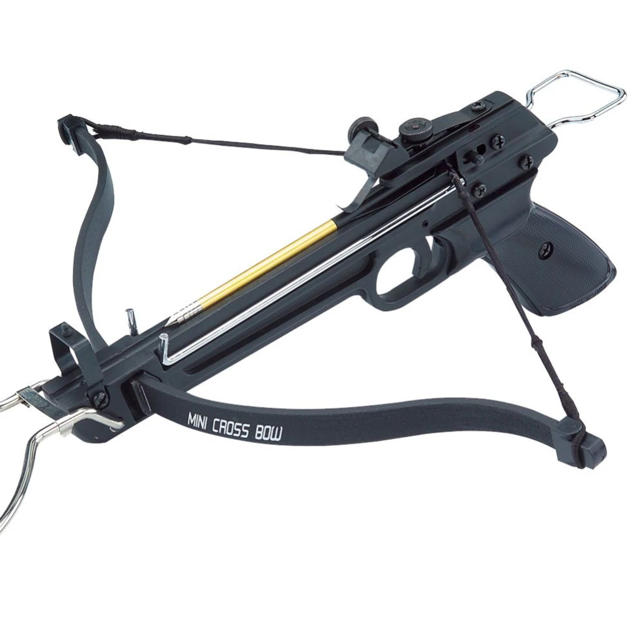 The Self-cocking crossbow features a simple and safe use while ensuring precise string alignment. Its all aluminum construction with High-Tech fiberglass prod makes this crossbow heavy and sturdy. It has an Auto safety that engages when cocking. This mini-crossbow package includes 3 arrows, prods and bow string! Draw Wight: 80 lbs, 160 Feet Per Second, 5 inch Power Stroke. Overall Length: 17 inch