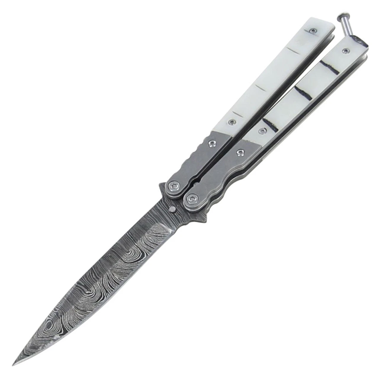 The blade of this butterfly knife is made from Damascus steel in a tanto style for precise cuts and slashes. Its made from 1095/15N20 alloy steel. A billet is forged, hammered, and heated so that a pattern shows on the blade. The HRC is around 54 to 55 with 176-180 true blade layers. The handle is double-walled with a steel inner frame. The outer steel frame has a stonewash finish with white ABS mounts that have black accents. There is also a safety latch so the knife wont come open when not in use. Overall Length: 8.75 Inches