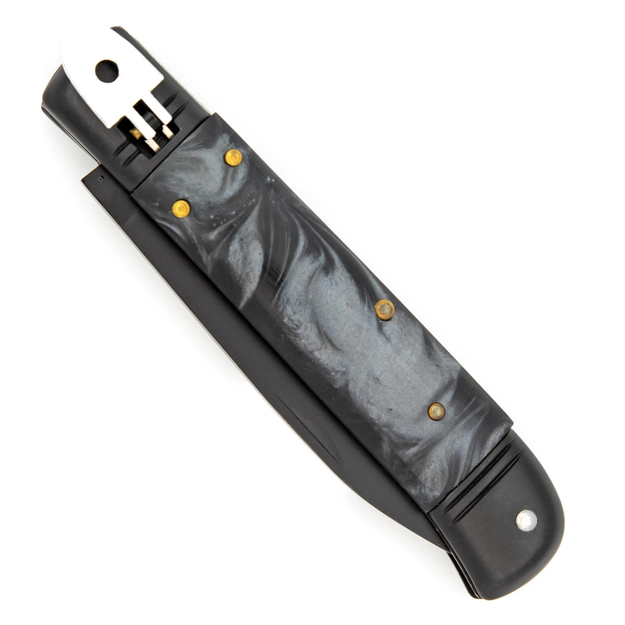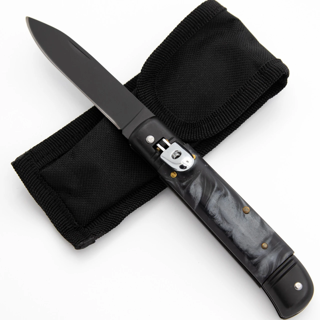 The stars scattered against the pitch-black expanse of freezing space are mirrored in the pearly black handle of the Splayed Stars Lever Lock Knife. The blade on this knife is black anodized stainless steel and the hardware matches so this knife is fully blacked-out, resulting in a cool and mysterious look. This knife is an automatic knife with a lever lock mechanism which means that there is a lever on the bolster. If this lever is pressed down then the blade will deploy, swinging out of the left side of the handle. You press the lever down again to unlock the blade so you can guide it back into the handle to close it. If you flip the lever up then the blade cannot deploy. For even safer carry and storage, the Splayed Stars Lever Lock Knife comes with its own black nylon sheath with a belt loop. Overall Length: 8 Inches, Blade Length: 3.5 Inches