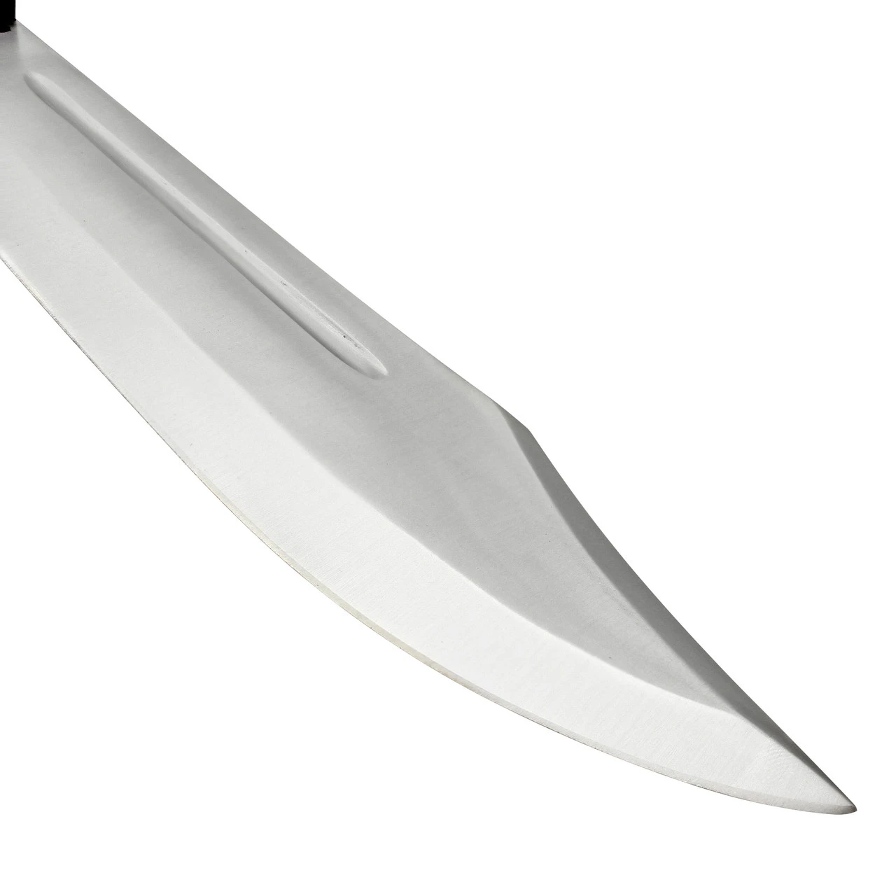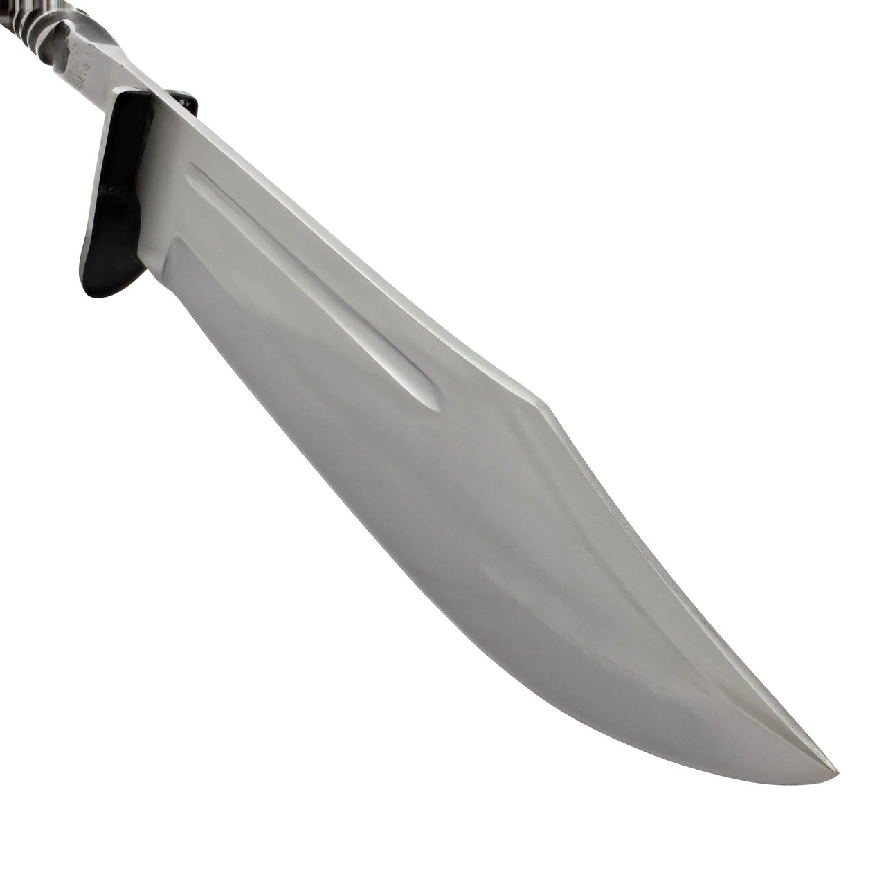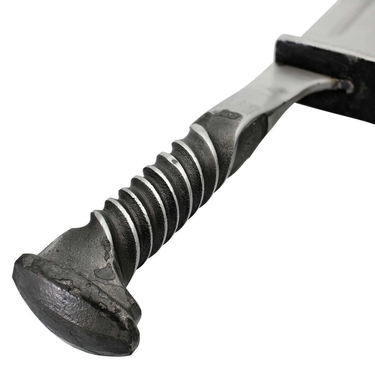 The Steel Flourish is a hand forged knife made from an authentic high carbon steel railroad spike. The 9.5-inch blade is in the clip point style and features a fuller on both sides to lower and disperse weight for more precise use. A lovely, two-tone twist design adorns the handle with the twists becoming tighter as they descend to the pommel. A bluing technique is used to darken the base around the spirals, making them stand out beautifully. The pommel is the classic railroad spike head which calls back to its origin. This knife would be perfect for hunting or camping with its large, broad blade and full tang. Included with the Steel Flourish Railroad Spike Knife is a genuine leather sheath equipped with a belt loop so you can take this knife on the go when hunting or camping easily. Overall Length: 15 Inches. Weight: 1.65 lbs.
