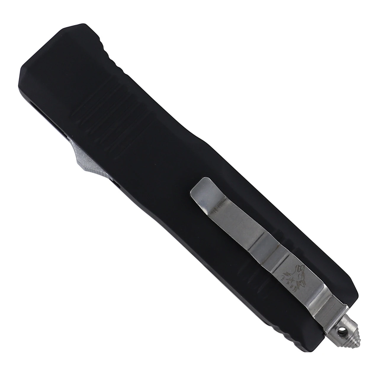 Just the weight of this incredible OTF knife in your hands lets you know that it is built tough and made to last. This deluxe automatic knife based off the hit action movie was made for someone with a large grip. The blade is dual-action, meaning you can use the silver thumb slide on the side of the handle to eject and retract the blade with ease. The blade itself is made from stainless steel with a with a shiny mirrored finish and spear head design. The partially-serrated edges of the blade add to its intimidating aura. The handle is made out of durable zinc alloy held together by six large hex screws, and comes in a classy yet ominous matte black finish. a sturdy steel pocket clip is located on the back side of the handle, and a glass breaker on the end in case of emergency. Included is a free nylon sheath.