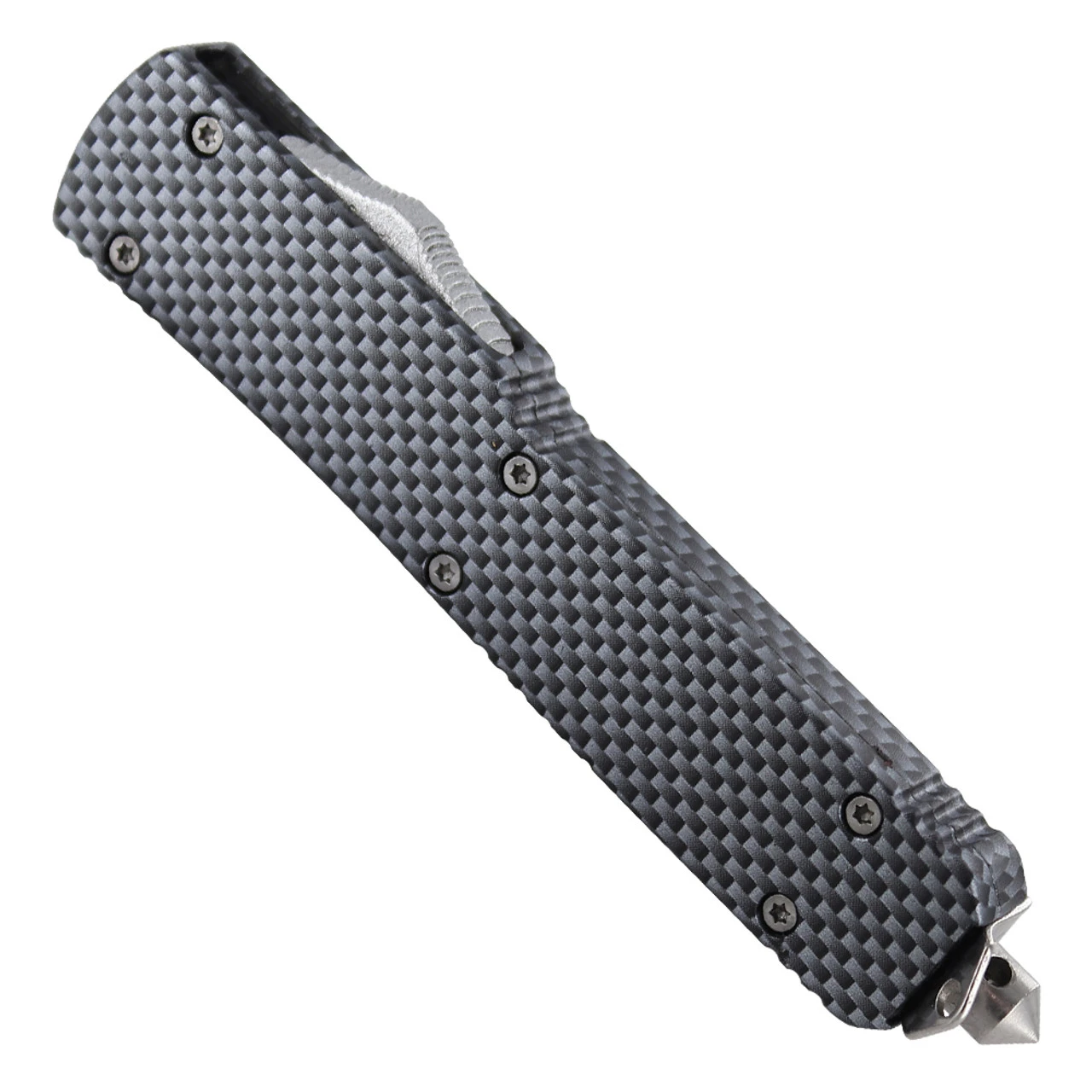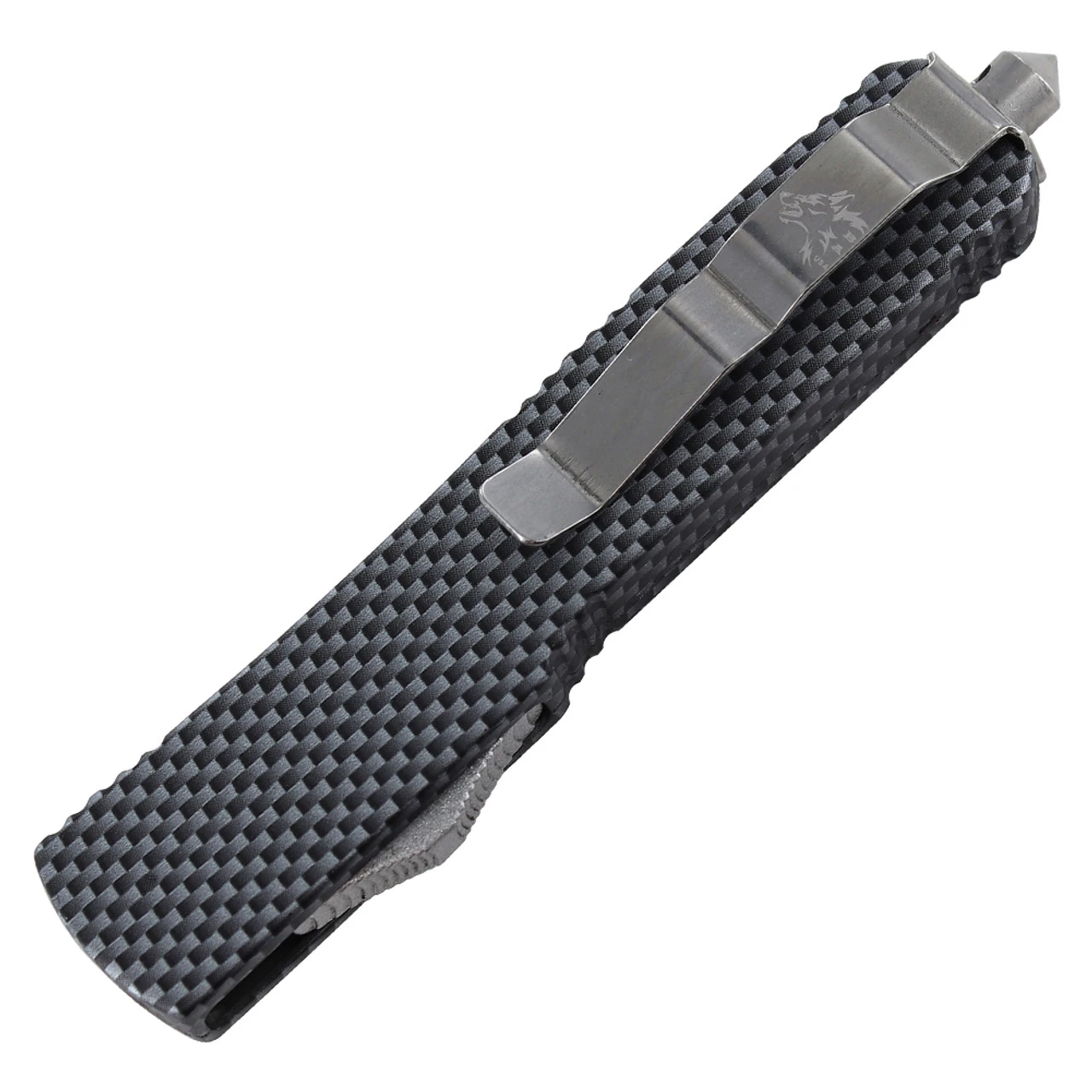 If a durable automatic OTF knife that wonโt break your budget is what you are looking for, then look no further. This knife may not look like much just looking at the lightweight zinc alloy handle with a carbon fiber design, but when you use your finger to slide the button located on the spine of the handle upwards, the blade pops out of the front of the handle and it become obvious that you arenโt messing around. The stainless-steel blade features a drop point style, but gives the appearance of a spear point to catch your opponent off guard. the partial serration on the blade and the glass breaker on the end of the handle turn this OTF knife into a tactical weapon. If youโre in a dangerous situation that requires you to cut off your seatbelt and break the window of your car, youโre all covered with just one knife. The steel pocket clip on the handle lets you carry your knife with ease, but if you prefer to keep it out of sight, we have provided a free nylon carrying case as well. Overall Length: 8.38 Inches, Blade Length: 3.38 inches