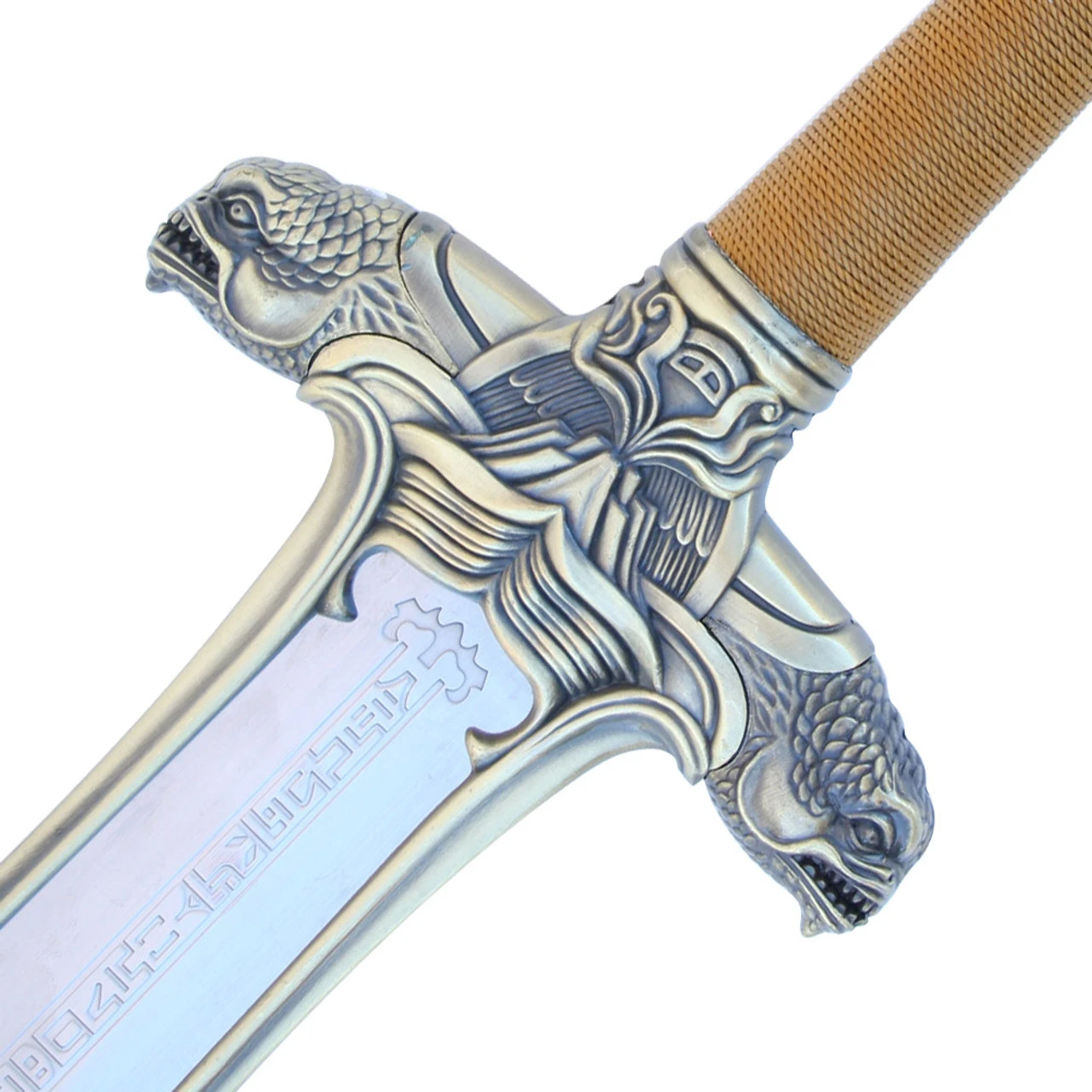 Professionally mirror polished, the 440 Stainless Steel blade is a work of art. It houses a fuller and has a blunt double-sided edge. Atlantean engravings are inscribed into the mirror polished steel blade. The guard and pommel are durable cast aluminum and look like a classic bronze age treasure. Artwork is placed across the guard and pommel illustrating the Legendary tale of The Barbarian. The Golden cord wrapped handle is finely crafted for absolute detail. The Barbarian Hero Sword comes with a wooden display plaque to proudly hang on a wall.