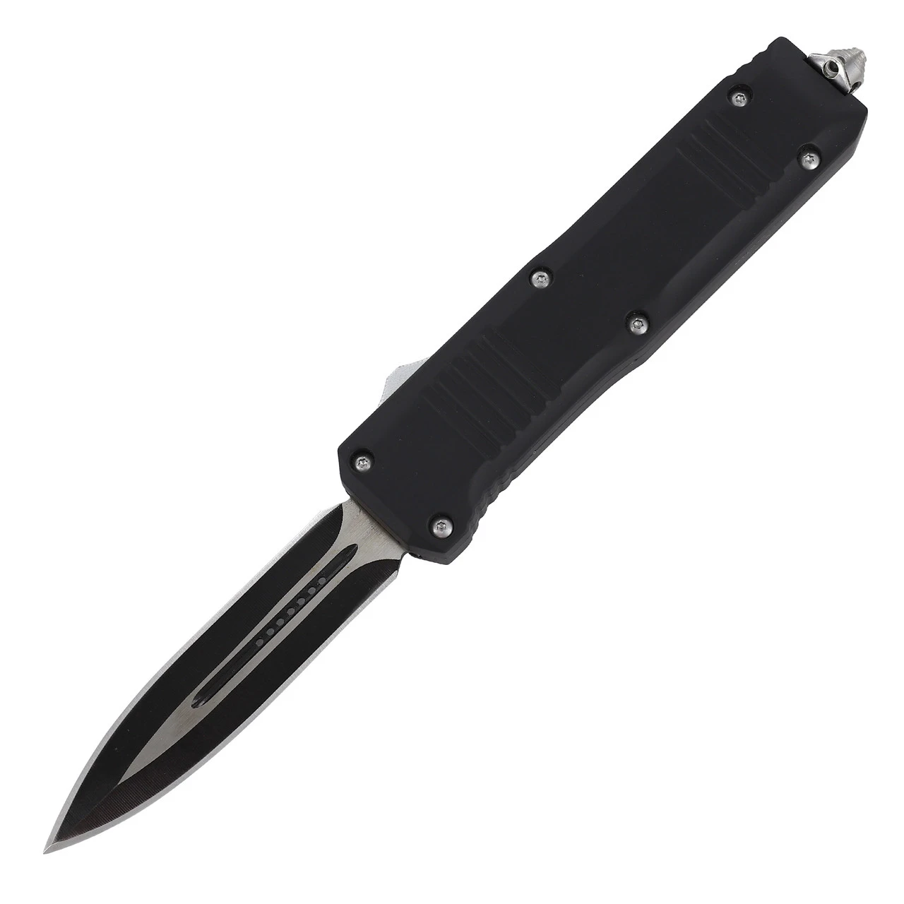 Features:Heavy DutyAutomaticDual ActionOut the FrontBlade Material: Stainless SteelSpear Point StyleTwo-Toned FinishHandle Material: Zinc Alloy; Matte Black FinishSilver Pocket Clip/Hardware Specifications:Overall Length: 9.5 inchesBlade Length: 3.75 inchesHandle Length: 5.75 inches