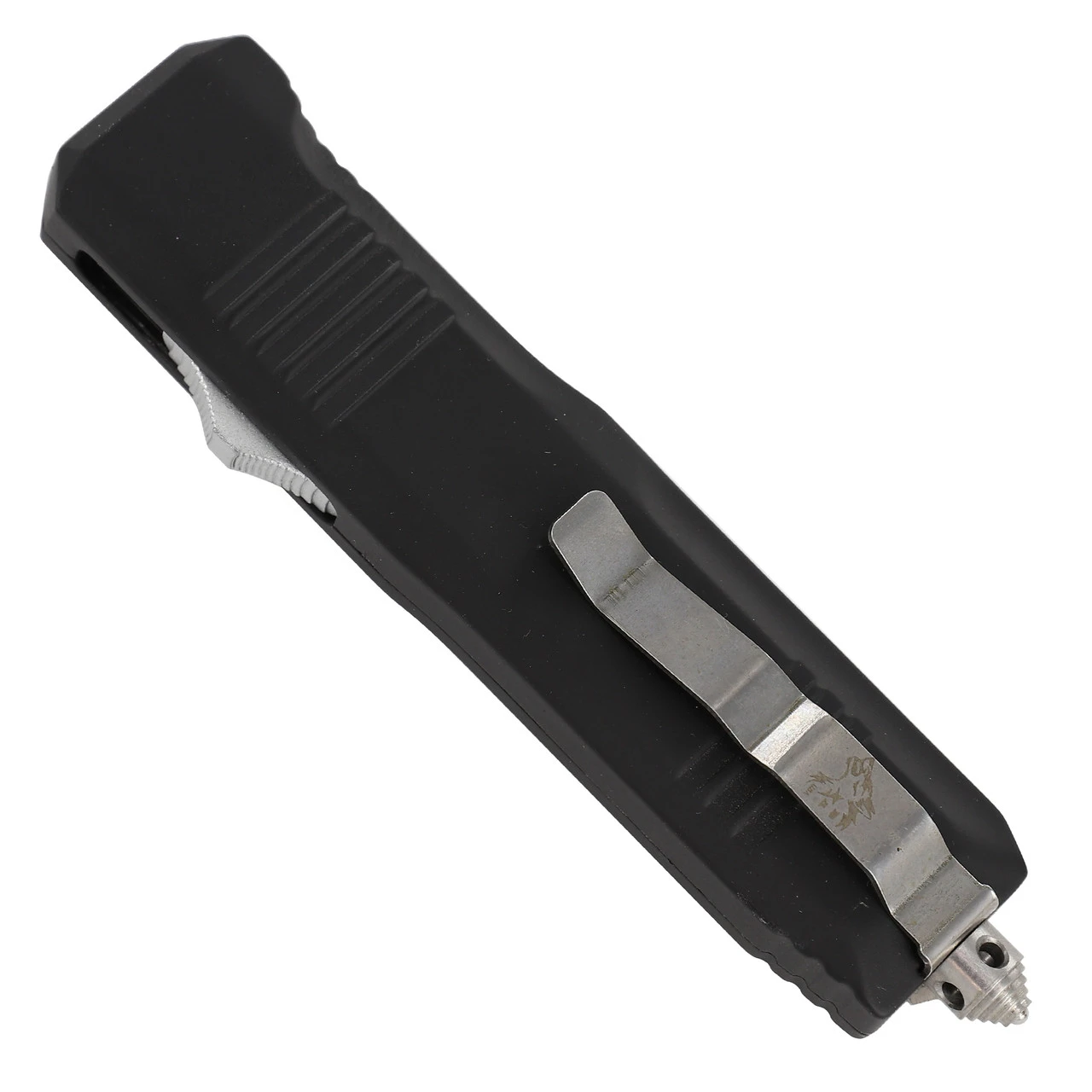 Once you get your hands on this badass automatic out the front knife, you’ll wonder why you ever thought you needed any other knife. This knife is a MUST HAVE for any OTF enthusiast or knife collector. The stainless-steel blade is formed into a spear or dagger point style, which is perfect for stabbing and thrusting. Not only is this knife beautiful, but it is also quick and deadly. The trigger can be used to deploy the blade almost instantly. We put the trigger on the side of the zinc alloy handle to make this knife easier to carry. The handle is coated with a matte black finish for a sleek appearance. A silver pocket clip is mounted on the handle, as well as an emergency glass breaker. Included with your purchase is a free black quick release sheath complete with belt loop.