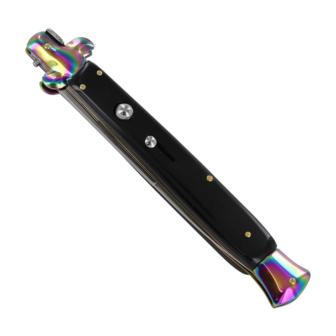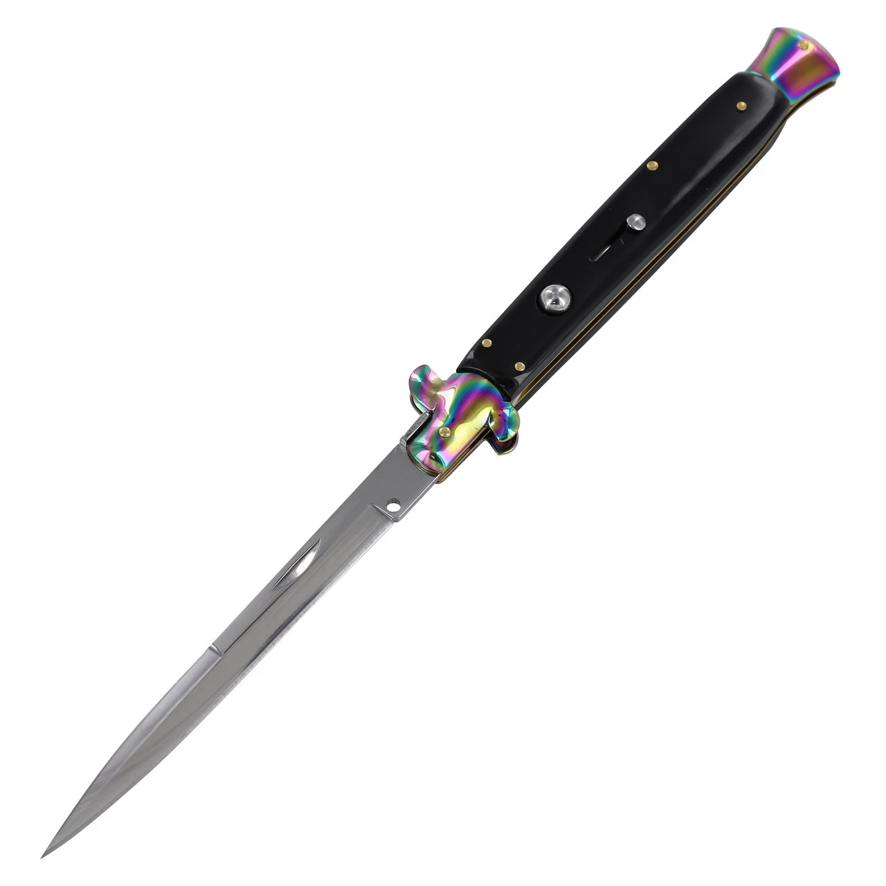 This Italian Milano is a true monster of a knife. This massive knife measures at a whopping 12 ½ inches. This deluxe stiletto sports a stainless-steel blade with a shiny mirror polish finish. To open the knife, you will press the shiny silver button at the top of the black ABS handle. To close, push the titanium t-shaped bolster above the handle toward the base. A slide lock on the handle prevents accidental opening while not in use. Included with this knife is a free black nylon quick release sheath with belt loop for easy carry. Overall Length: 12.50 Inches, Blade Length: 5.62 Inches