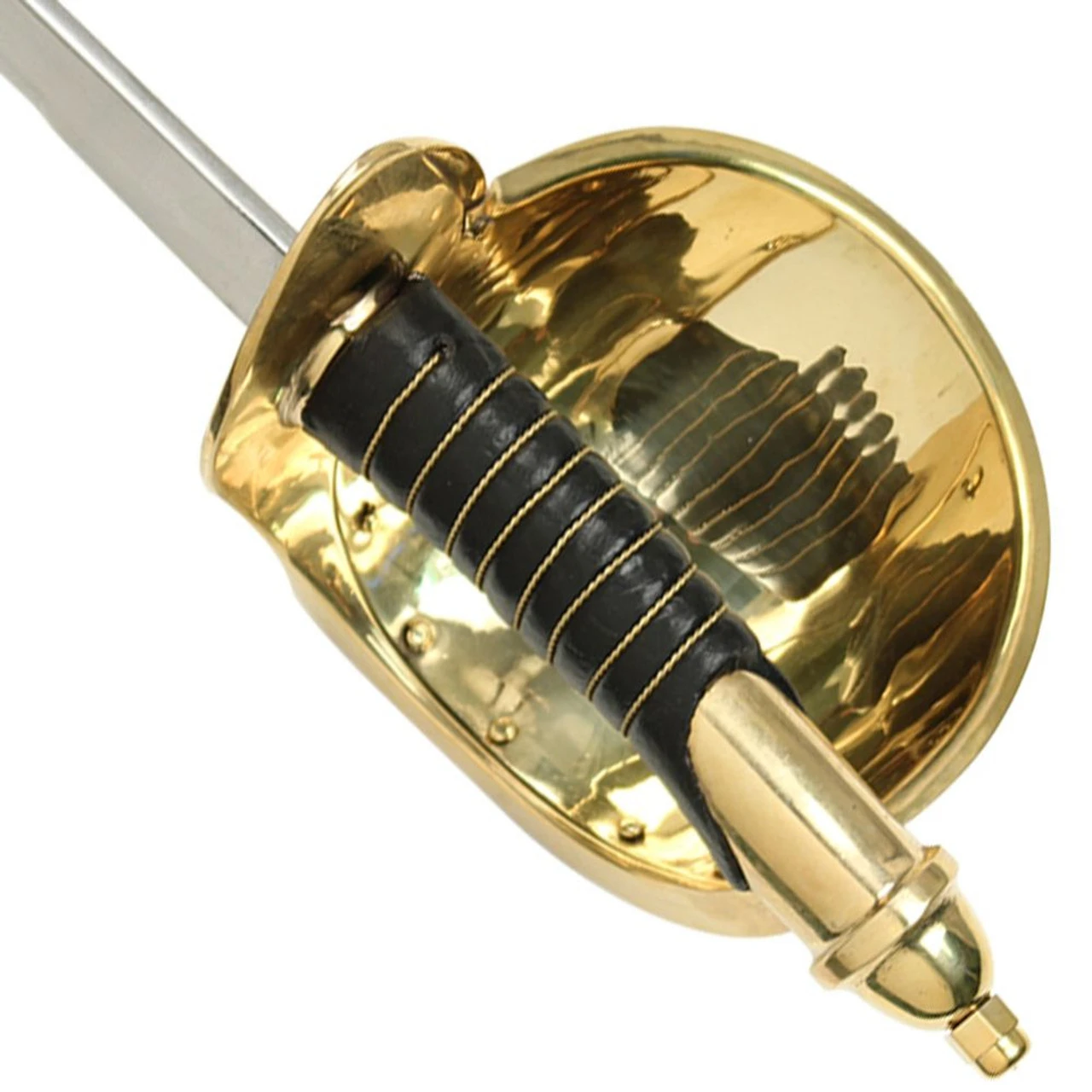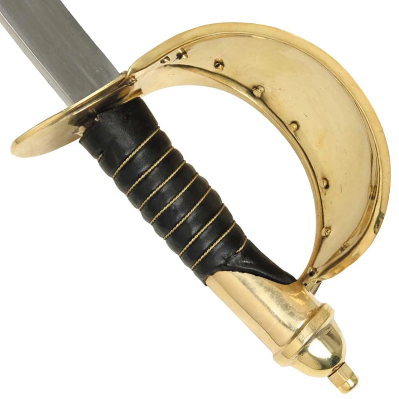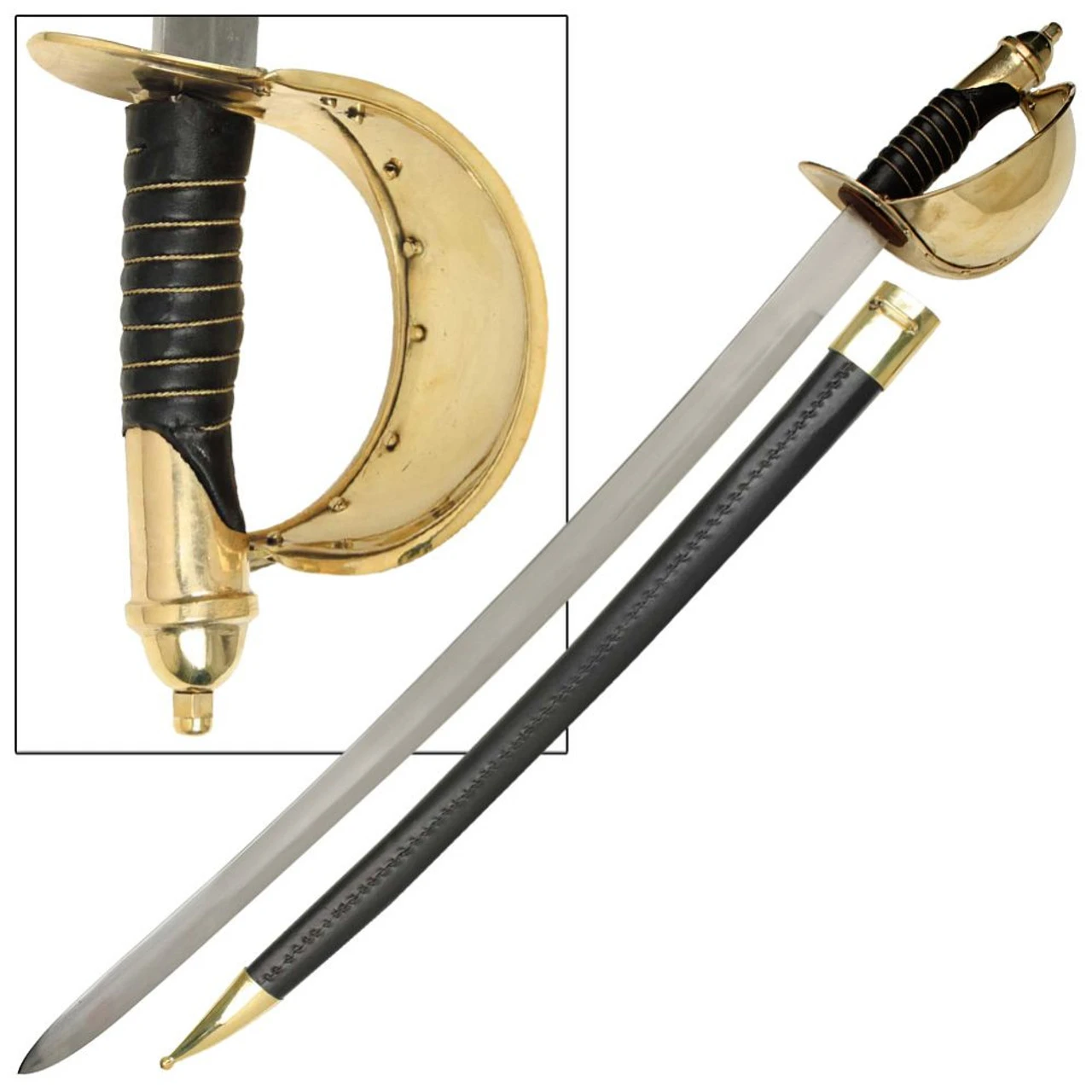 The U.S 1860 Naval Cutlass is constructed of carbon steel with a brass basket style hand guard. The handle is leather wrapped with brass accents and pommel. Included is a wooden scabbard with brass accents and leather wrapped. Overall length is 33 inches.
