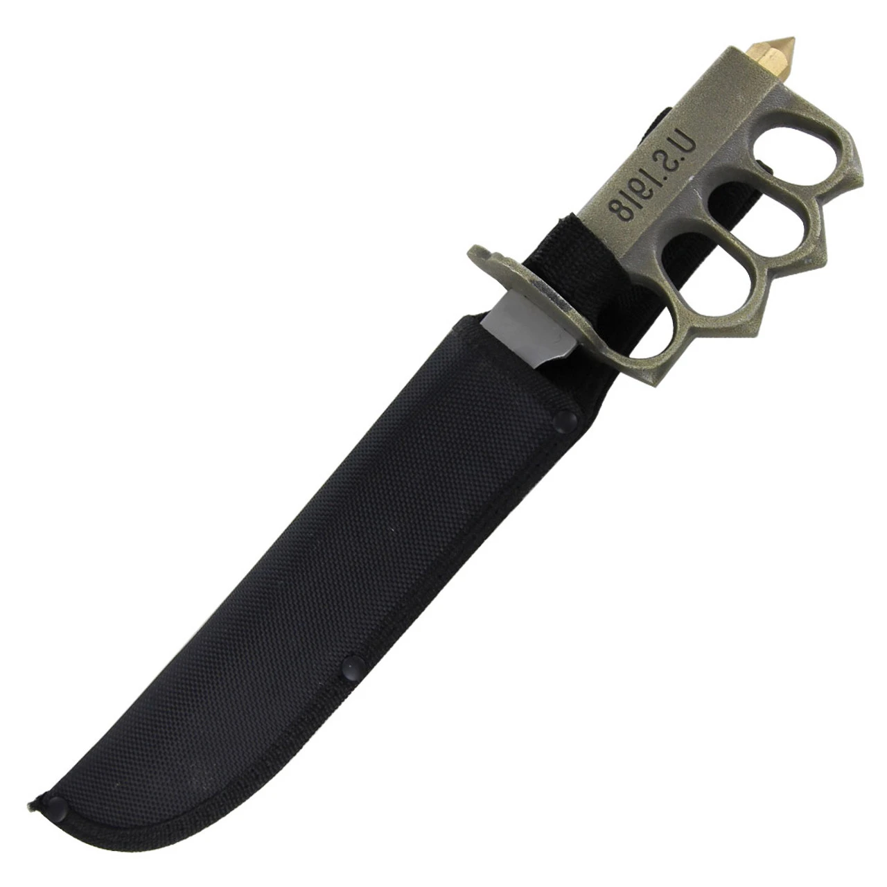 This knife comes equipped with a bolo style blade made of stainless steel with a satin finish. The handle is a cast metal design with U.S. 1918 on one side. A short guard protects the users hands while they use the fully functional knuckleduster to bust their enemy in the face and if that isnt enough, the striking pommel will finish the job or you can use it as a glass breaker if need be. It also comes with a nylon sheath with a belt loop. Overall Length: 13 Inches.