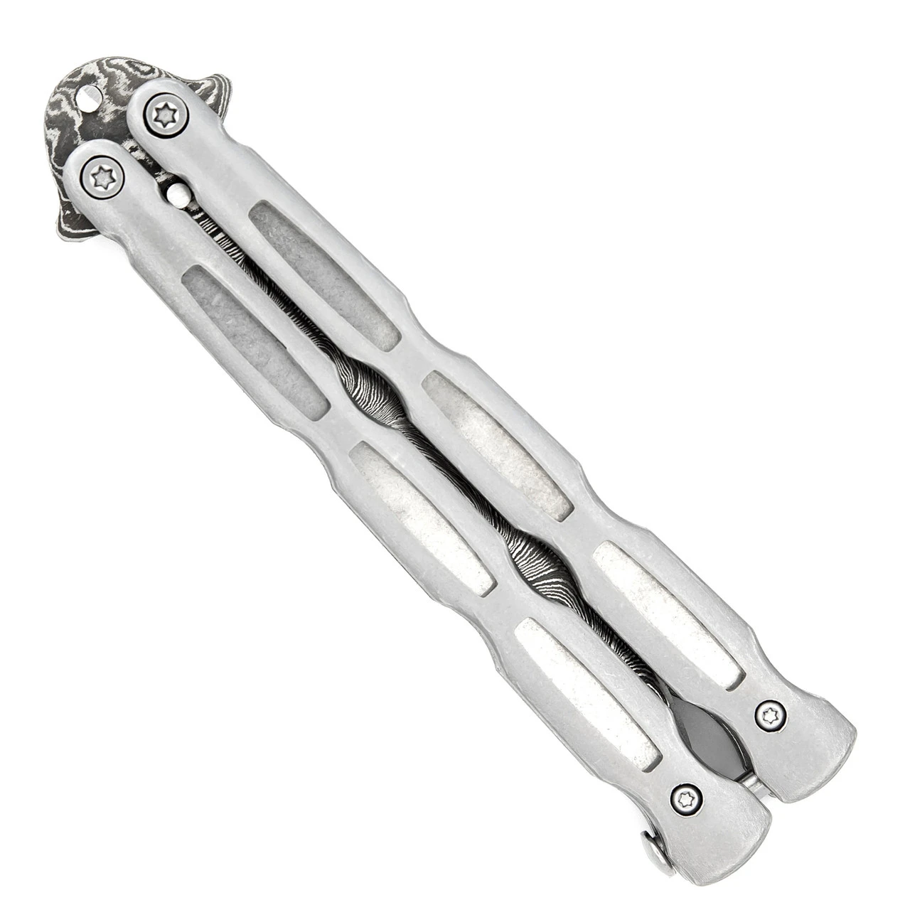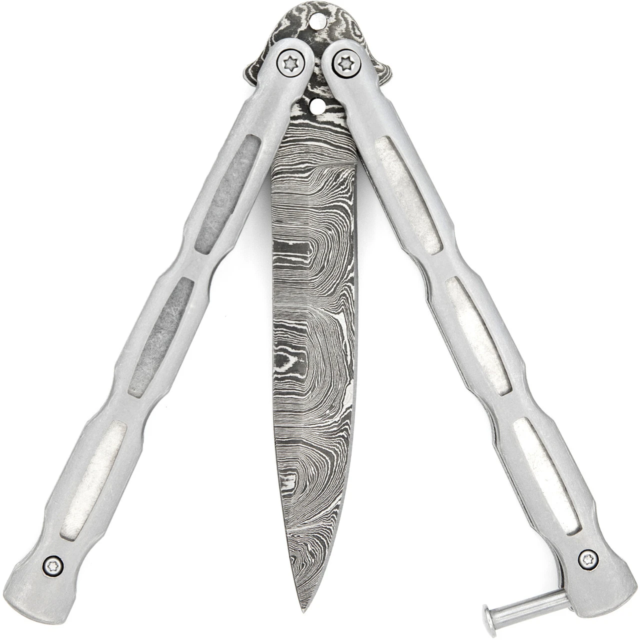 Sporting a Damascus steel 4 inch blade that is razor sharp with a gorgous wavelike finish, this premium balisong butterfly knife is ready for action! Chain link shaped cutouts on the handle help to reduce the weight of the knife which improves flipping ability. The stainless steel handle also features a silver finish and is very light in weight but at the same time extremely durable. A metal safety latch is included to lock the blade into place when it is not in use as well as when it is deployed. Also known as a balisong, a butterfly knife is a folding pocket knife with two handles counter-rotating around the tang such that, when closed, the blade is concealed within grooves in the handles. Butterfly knives are especially useful in situations where it is inconvenient to use both hands to open a knife. Please make sure to check your local laws regarding the procession and import of these knives. Overall Length: 8.875 Inches Blade Length: 4 Inches