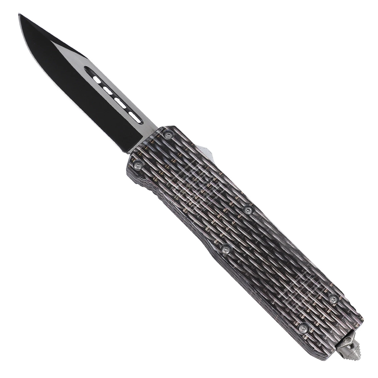 This heavy duty out the front knife exudes coolness. The handle is made from a premium zinc alloy aluminum held together with 6 durable hex screws and features a carbon fiber finish. Just stunning! The dual action slide trigger deploys and retracts the blade with extreme speed flawlessly. The butt comes equipped with a silver glass breaker in case of emergencies. The two-tone blade is composed of stainless steel and comes in a classic drop point style. Included is a quick release black nylon sheath.