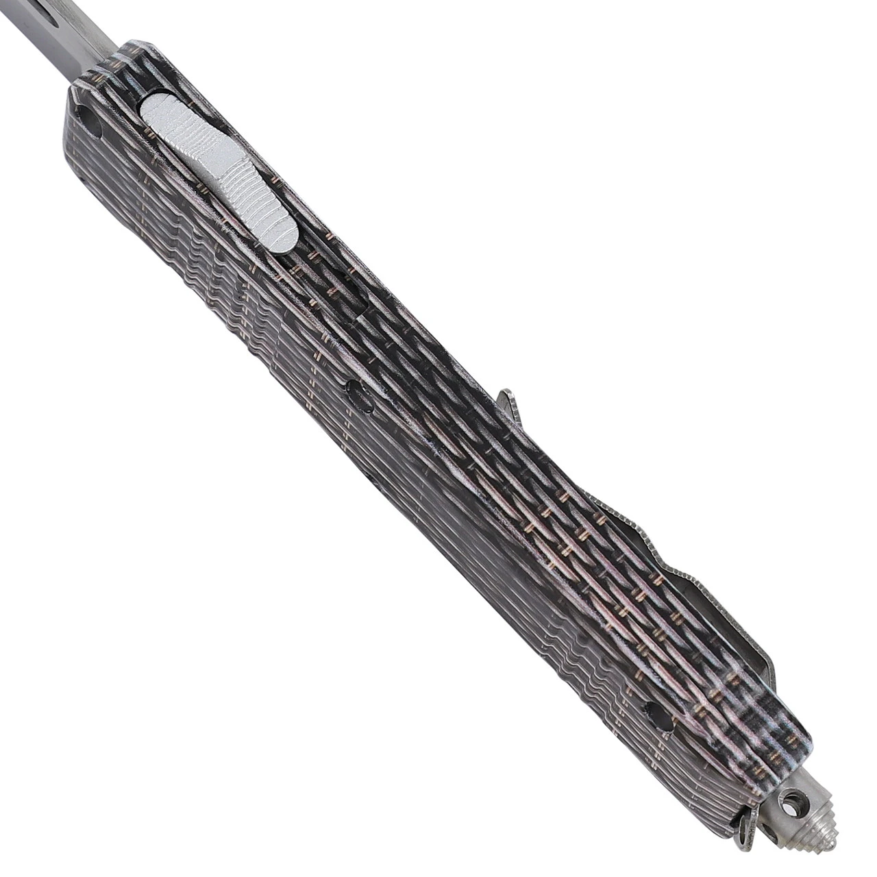 Features:Heavy DutyAutomaticDual ActionOut the FrontBlade Material: Stainless SteelDrop Point StyleTwo-Toned FinishHandle Material: Zinc Alloy; Carbon Fiber FinishSilver Pocket Clip/Hardware Specifications:Overall Length: 9.5 inchesBlade Length: 3.75 inchesHandle Length: 5.75 inches