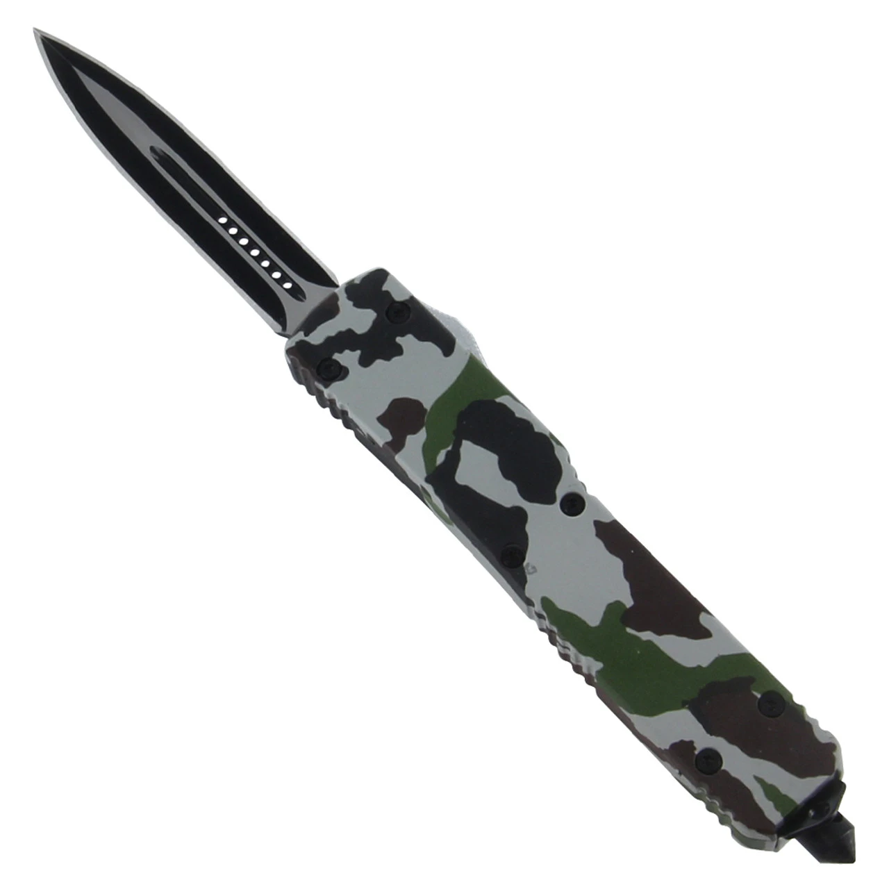 If youโre looking for a knife that is easy to conceal and is fast-acting in an emergency situation, an OTF may be the right knife for you. OTF stands for Out the Front, meaning the blade opens and closes through a hole in one end of the handle. The blade slides parallel with the handle to deploy. Ours has a dual action mechanism allows you to deploy and retract the blade by using a thumb slide located on the side of the handle. There is also a pocket clip and a glass breaker in case of emergency. The Camouflage pattern on the handle may make it tricky to find, so be sure not to lose it! The blade itself is forged from stainless steel in a spear-point style and has a menacing two-toned finish. A nylon quick release sheath is included to house your knife and transport your blade in style. Overall Length: 8 3/8 inches, Blade Length: 3 3/8 inches