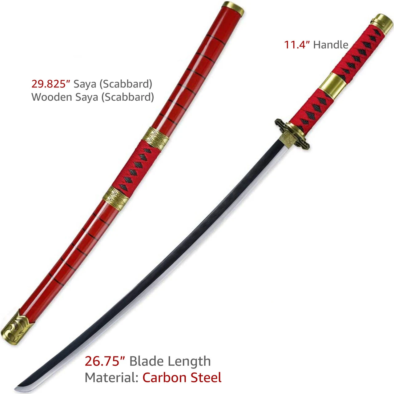 That’s right, this is indeed the one of the 3 swords currently carried by the legendary Pirate Hunter turned pirate himself in the very popular anime series we all know and love. This sword is legend to be cursed, bringing only great misfortune to its owner. Constructed from carbon steel, this replica of the famous red samurai sword will not disappoint. The blade is a full 29-inches in length and sports a sleek black and silver finish. The 12-inch handle is made from sturdy wood and features black faux ray skin wrapped with striking red rayon in a traditional Japanese style. The cross-like metal guard has polished gold accents that match the pommel and intersection of the handle. Included with this sword is a highly detailed wooden scabbard that features a red lacquer finish completed with metal accents as well as a rayon-wrapped mid-section that perfectly matches the handle of the sword. Overall length: 41 inches, Blade length: 29 inches